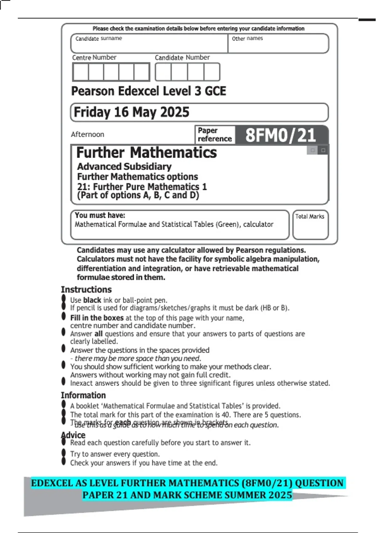 EDEXCEL AS LEVEL FURTHER MATHEMATICS (8FM0/21) QUESTION PAPER 21 AND MARK SCHEME SUMMER 2025