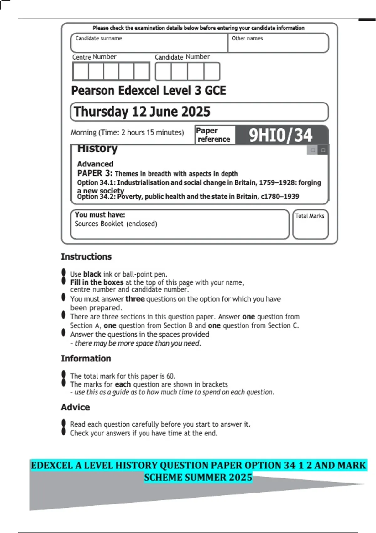 EDEXCEL A LEVEL HISTORY QUESTION PAPER OPTION 34 1 2 AND MARK