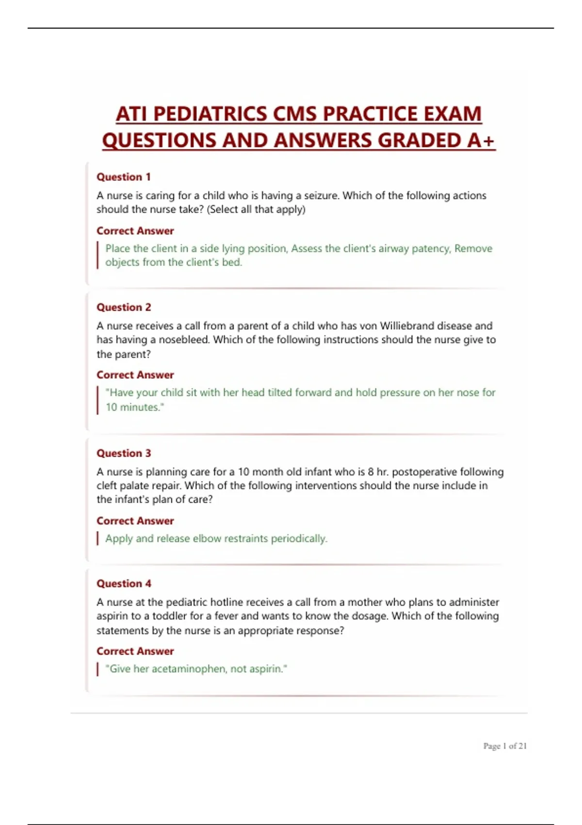 ATI PEDIATRICS CMS PRACTICE EXAM QUESTIONS AND ANSWERS.