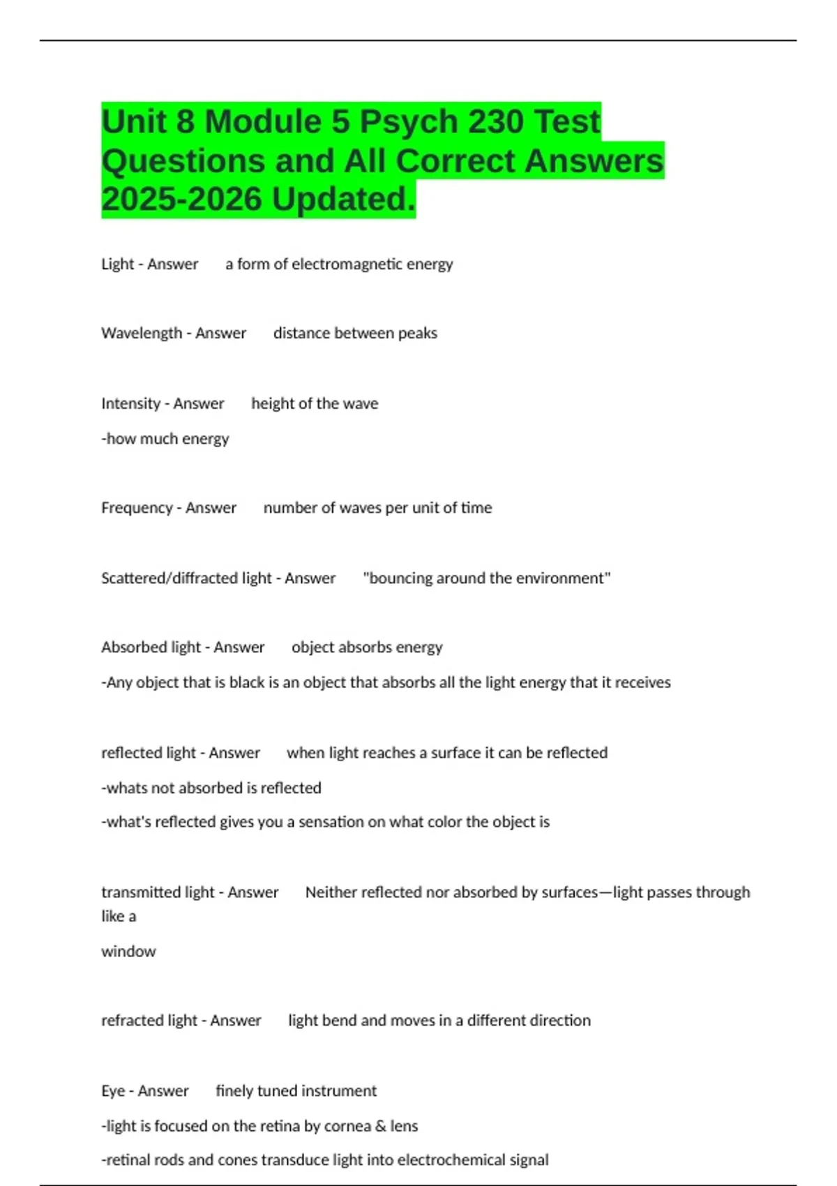 Unit 8 Module 5 Psych 230 Test Questions and All Correct Answers Updated.