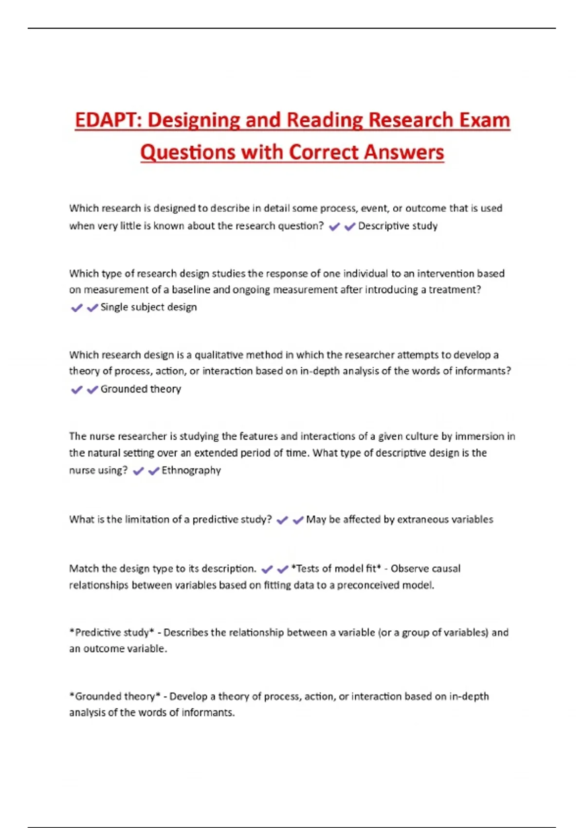 EDAPT: Data Collection Questions and Answers|Latest Update __________ is the entire set of subjects who are of interest to the researcher. __________ is the population that the researcher will actually study. Target population Sample What type of sampling strategy is used when a researcher selects subjects that are easily accessible to participate in a study? Convenience sampling What is the mathematical process to determine an adequate sample size in quantitative research? Power analysis