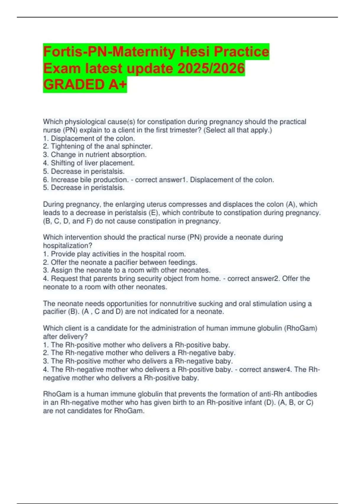 Fortis-PN-Maternity Hesi Practice Exam latest update 2025/2026 GRADED A+