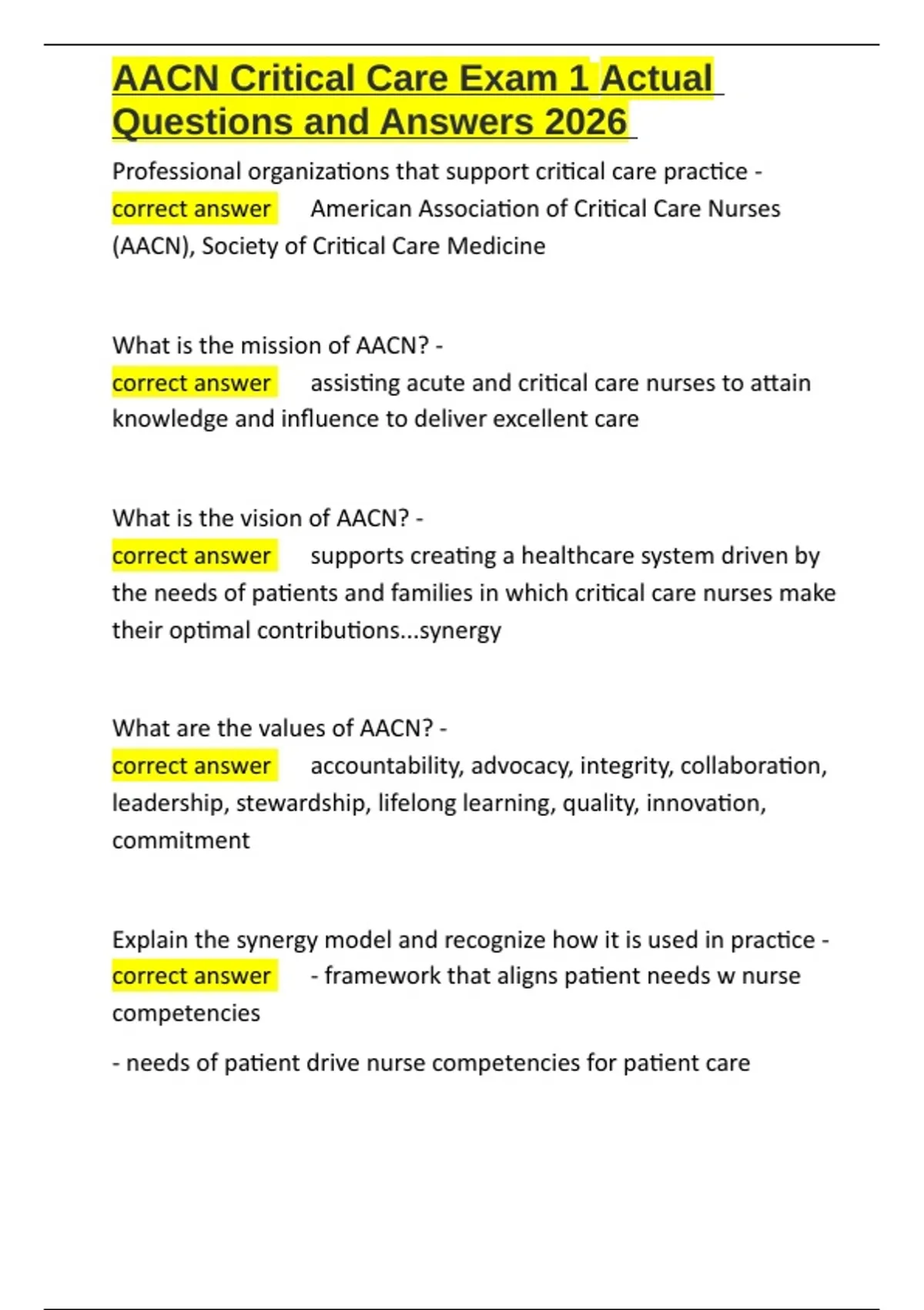, AACN Critical Care Exam 1 Actual