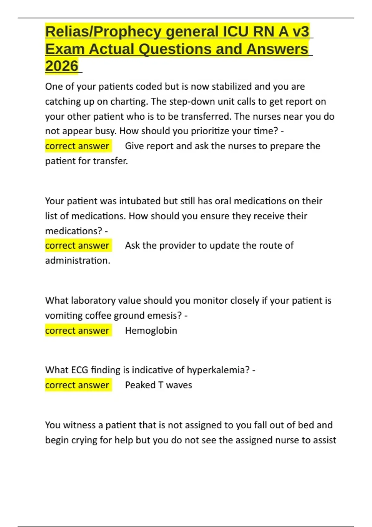 Relias Prophecy general ICU RN A v3 Exam Actual Questions and Answers