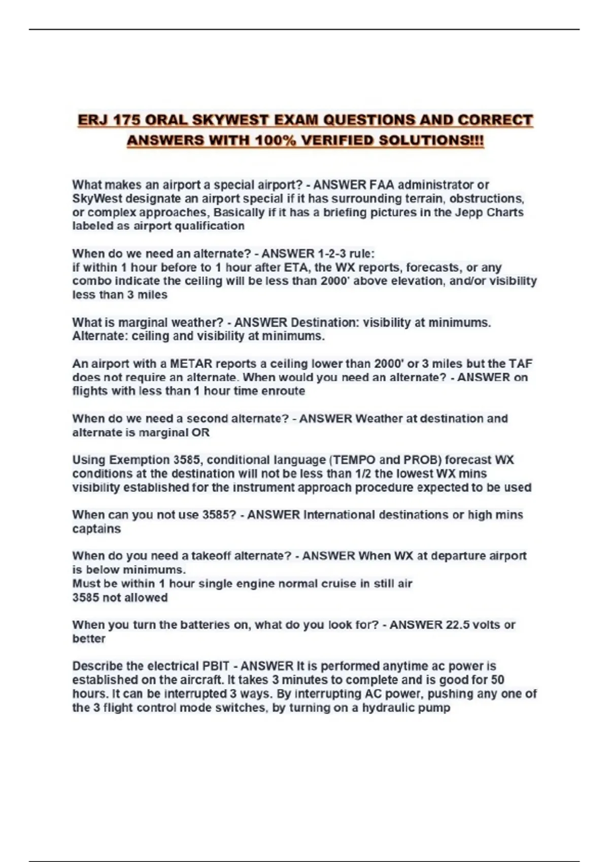 ERJ 175 ORAL SKYWEST EXAM QUESTIONS AND CORRECT ANSWERS WITH 100% VERIFIED SOLUTIONS!!!