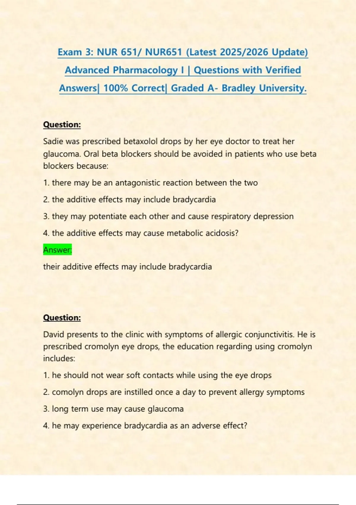 Exam 3: NUR 651/ NUR651 (Latest 2025/2026 Update) Advanced Pharmacology I | Questions with Verified Answers| 100% Correct| Graded A- Bradley University. Exam 3: NUR 651/ NUR651 (Latest 2025/2026 Update) Advanced Pharmacology I | Questions with Verified Answers| 100% Correct| Graded A- Bradley University.