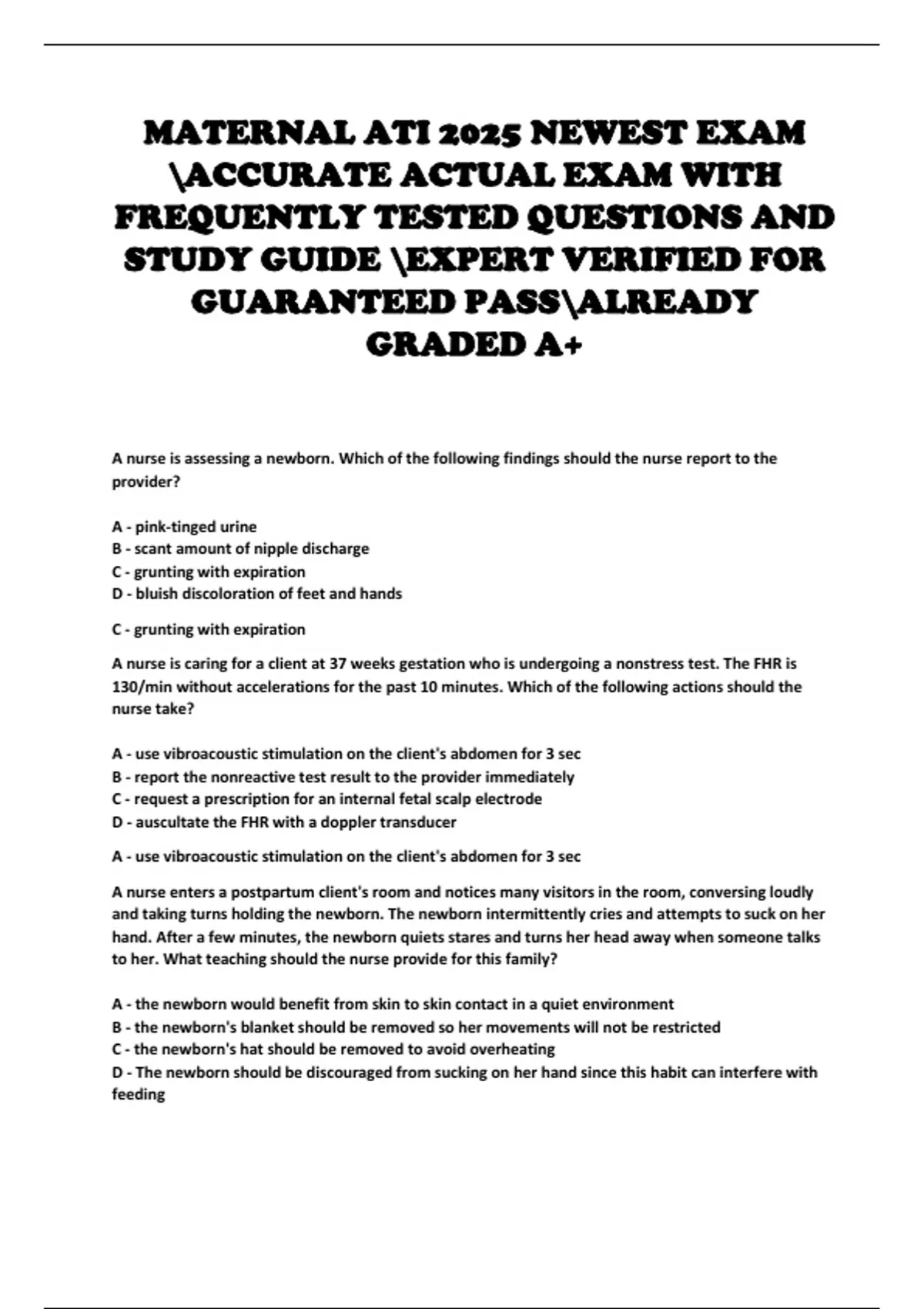 MATERNAL ATI 2025 NEWEST EXAM ACCURATE ACTUAL EXAM WITH FREQUENTLY TESTED QUESTIONS AND STUDY GUIDE EXPERT VERIFIED FOR GUARANTEED PASSALREADY GRADED A+