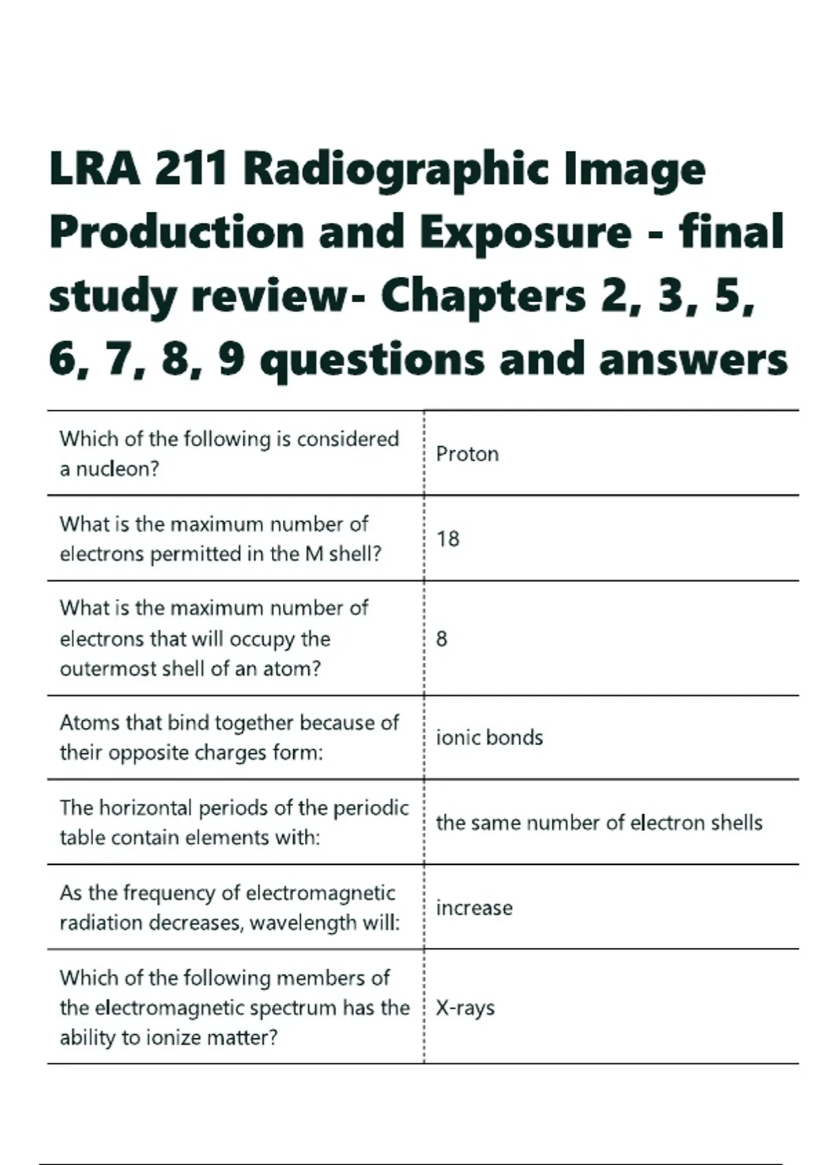 LRA 211 Radiographic Image Production and Exposure - final study review- Chapters 2, 3, 5, 6, 7, 8, 9 questions and answers