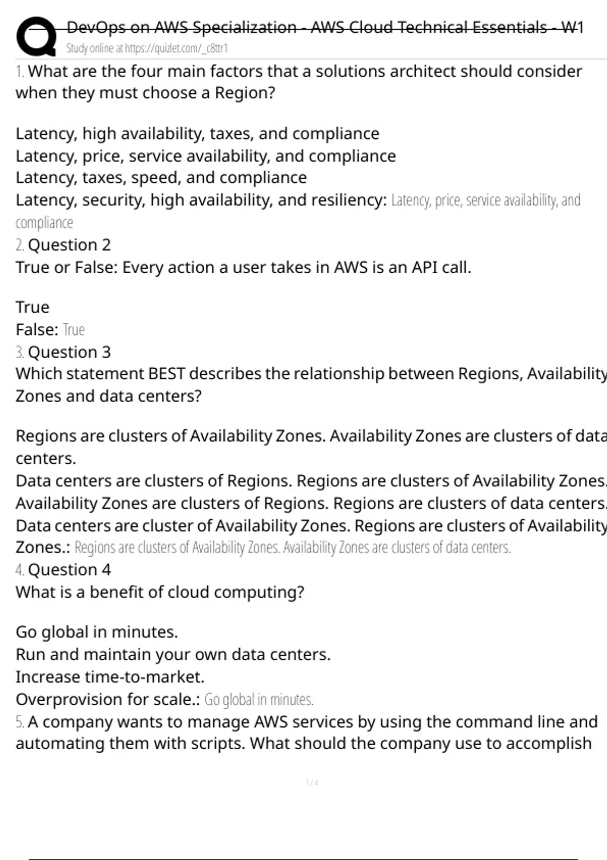 What are the four main factors that a solutions architect should consider when they must choose a Region? Latency, high availability, taxes, and compliance Latency, price, service availability, and compliance Latency, taxes, speed, and compliance Latency, security, high availability, and resiliency: Latency, price, service availability, and compliance 2. Question 2 True