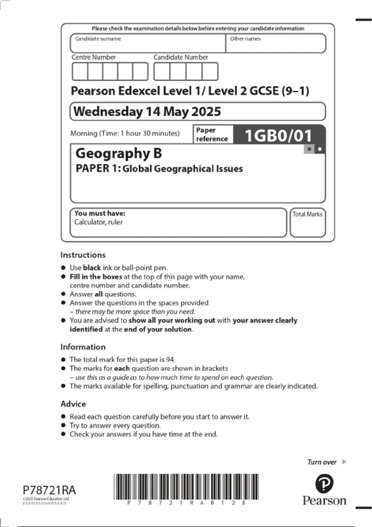 2025 Pearson Edexcel Level1/Level 2 GCSE (9–1) Geography B PAPER 1: Global Geographical Issues Combined Question Paper and Marking Scheme