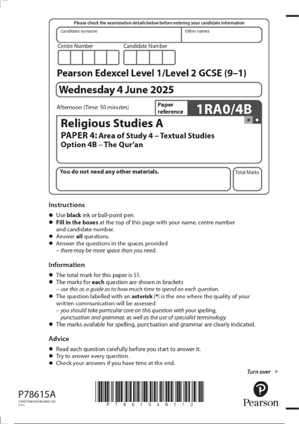 2025 Pearson Edexcel Level 1/Level 2 GCSE (9–1) Religious Studies A PAPER 4: Area of Study 4 – Textual Studies Option 4B – The Qur’an Combined Question Paper and Marking Scheme