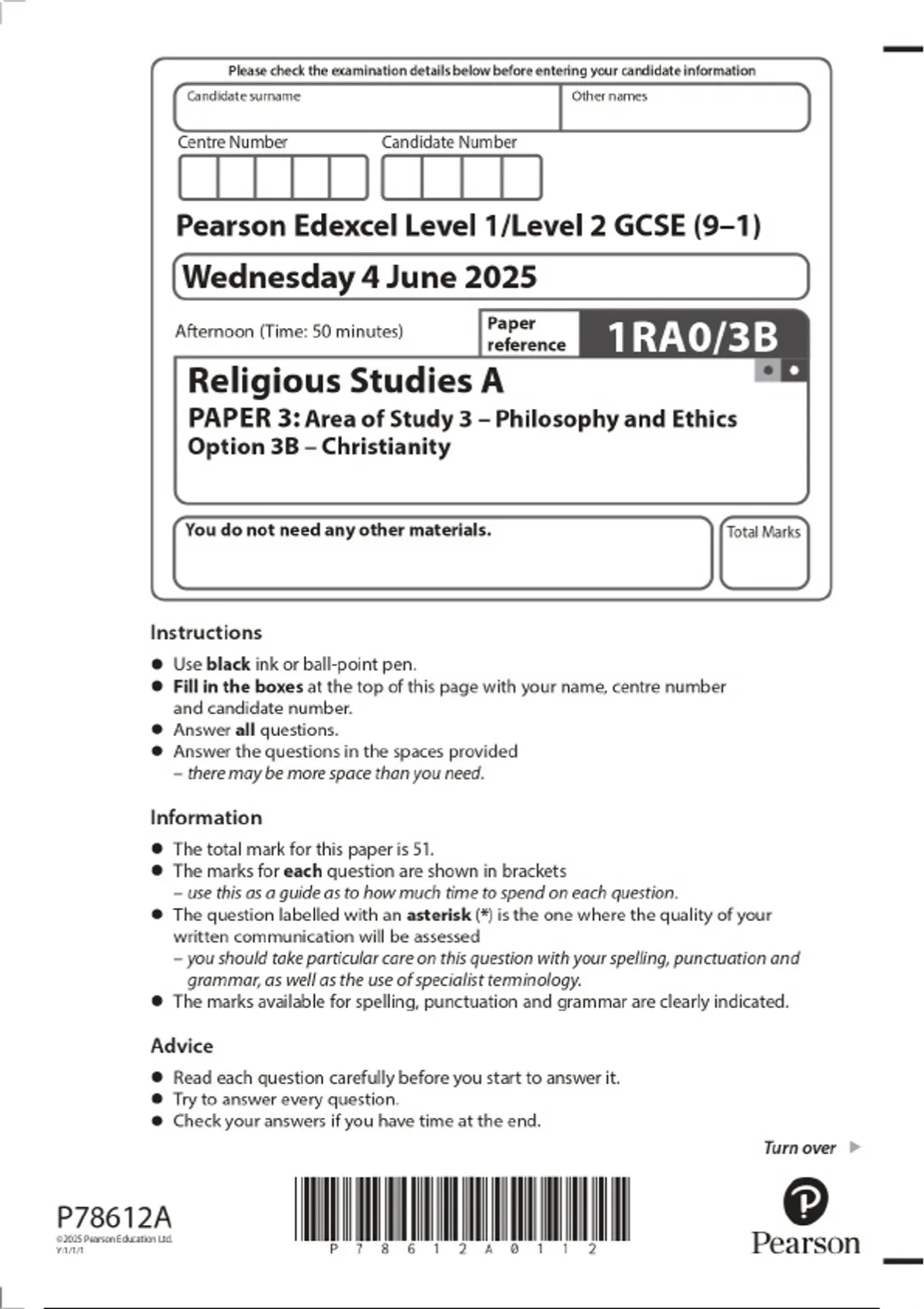 2025 Pearson Edexcel Level 1/Level 2 GCSE (9–1) Religious Studies A PAPER 3: Area of Study 3 – Philosophy and Ethics Option 3B – Christianity Combined Question Paper and Marking Scheme