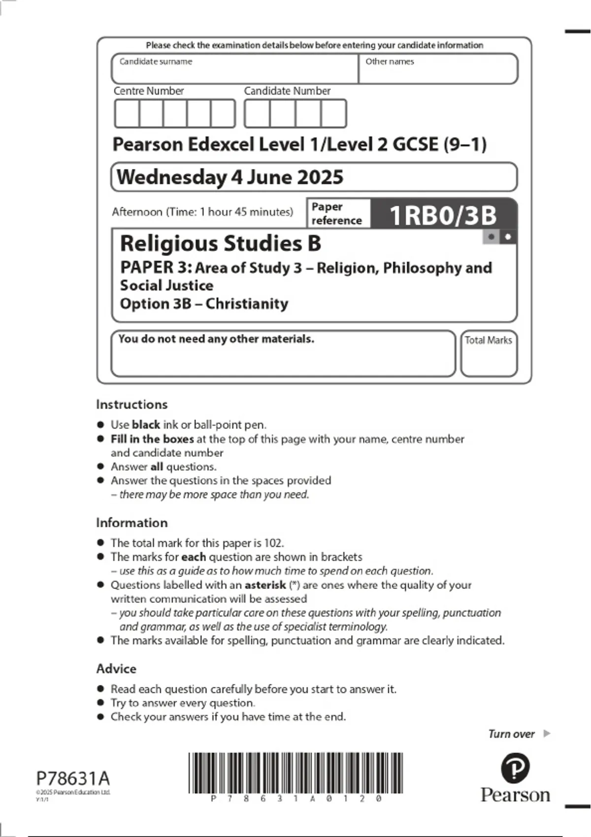 2025 Pearson Edexcel Level 1/Level 2 GCSE (9–1) Religious Studies B PAPER 3: Area of Study 3 – Religion, Philosophy and Social Justice Option 3B – Christianity Combined Question Paper and Marking Scheme