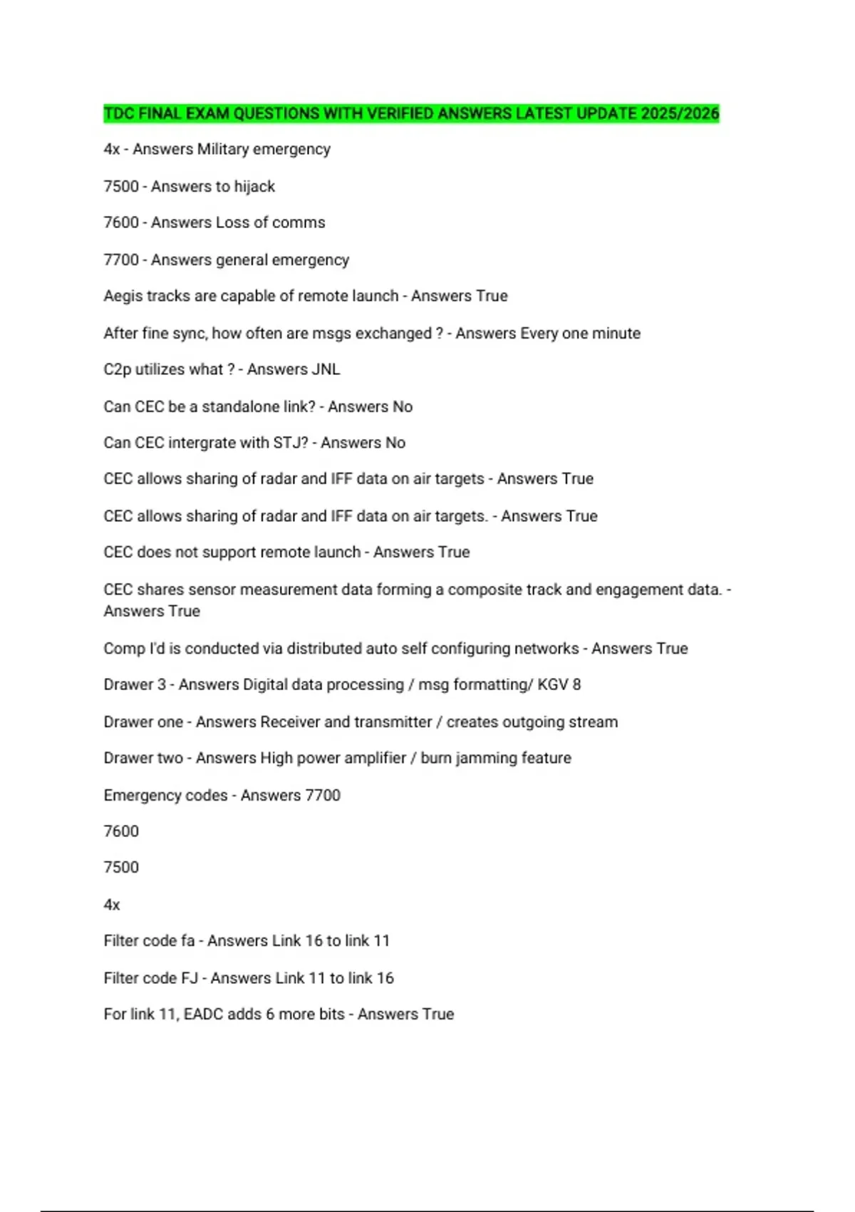 TDC FINAL EXAM QUESTIONS WITH VERIFIED ANSWERS LATEST UPDATE 2025/2026 4x - Answers Military emergency 7500 - Answers to hijack 7600 - Answers Loss of comms 7700 - Answers general emergency Aegis tracks are capable of remote launch - Answers True After fine sync, how often are msgs exchanged ? - Answers Every one minute C2p utilizes what ? - Answers JNL Can CEC be a standalone link? - Answers No Can CEC intergrate with STJ? - Answers No CEC allows sharing of radar and IFF data on air targets - Answers True CEC allows sharing of radar and IFF data on air targets. - Answers True CEC does not support remote launch - Answers True CEC shares sensor measurement data forming a composite track and engagement data. - Answers True Comp I'd is conducted via distributed auto self configuring networks - Answers True Drawer 3 - Answers Digital data processing / msg formatting/ KGV 8 Drawer one - Answers Receiver and transmitter / creates outgoing stream Drawer two - Answers High power amplifier / burn jamming feature Emergency codes - Answers 7700 7600 7500 4x Filter code fa - Answers Link 16 to link 11 Filter code FJ - Answers Link 11 to link 16 For link 11, EADC adds 6 more bits - Answers True How are timeslots assigned ? - Answers By function and platform How long is a frame? - Answers 12 seconds How many auto tones are in Clew? - Answers 16 How many bits are in a j series msg? - Answers 225 How many filters can the system save ? - Answers 16