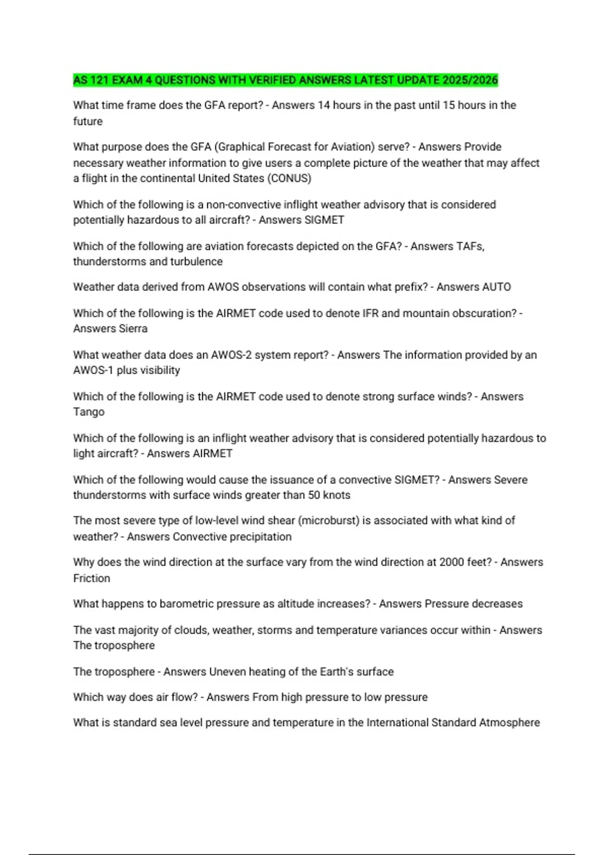 AS 121 EXAM 4 QUESTIONS WITH VERIFIED ANSWERS LATEST UPDATE 2025/2026 What time frame does the GFA report? - Answers 14 hours in the past until 15 hours in the future What purpose does the GFA (Graphical Forecast for Aviation) serve? - Answers Provide necessary weather information to give users a complete picture of the weather that may affect a flight in the continental United States (CONUS) Which of the following is a non-convective inflight weather advisory that is considered potentially hazardous to all aircraft? - Answers SIGMET Which of the following are aviation forecasts depicted on the GFA? - Answers TAFs, thunderstorms and turbulence Weather data derived from AWOS observations will contain what prefix? - Answers AUTO Which of the following is the AIRMET code used to denote IFR and mountain obscuration? - Answers Sierra What weather data does an AWOS-2 system report? - Answers The information provided by an AWOS-1 plus visibility Which of the following is the AIRMET code used to denote strong surface winds? - Answers Tango Which of the following is an inflight weather advisory that is considered potentially hazardous to light aircraft? - Answers AIRMET Which of the following would cause the issuance of a convective SIGMET? - Answers Severe thunderstorms with surface winds greater than 50 knots The most severe type of low-level wind shear (microburst) is associated with what kind of weather? - Answers Convective precipitation Why does the wind direction at the surface vary from the wind direction at 2000 feet? - Answers Friction What happens to barometric pressure as altitude increases? - Answers Pressure decreases The vast majority of clouds, weather, storms and temperature variances occur within - Answers The troposphere The troposphere - Answers Uneven heating of the Earth's surface Which way does air flow? - Answers From high pressure to low pressure What is standard sea level pressure and temperature in the International Standard Atmosphere (ISA)? - Answers 29.92 "Hg and 59 degrees F Which way does air circulate around a high pressure area (Northern Hemisphere) - Answers Clockwise The average temperature decrease within the troposphere is - Answers 2 degrees Celsius every 1000 feet of altitude