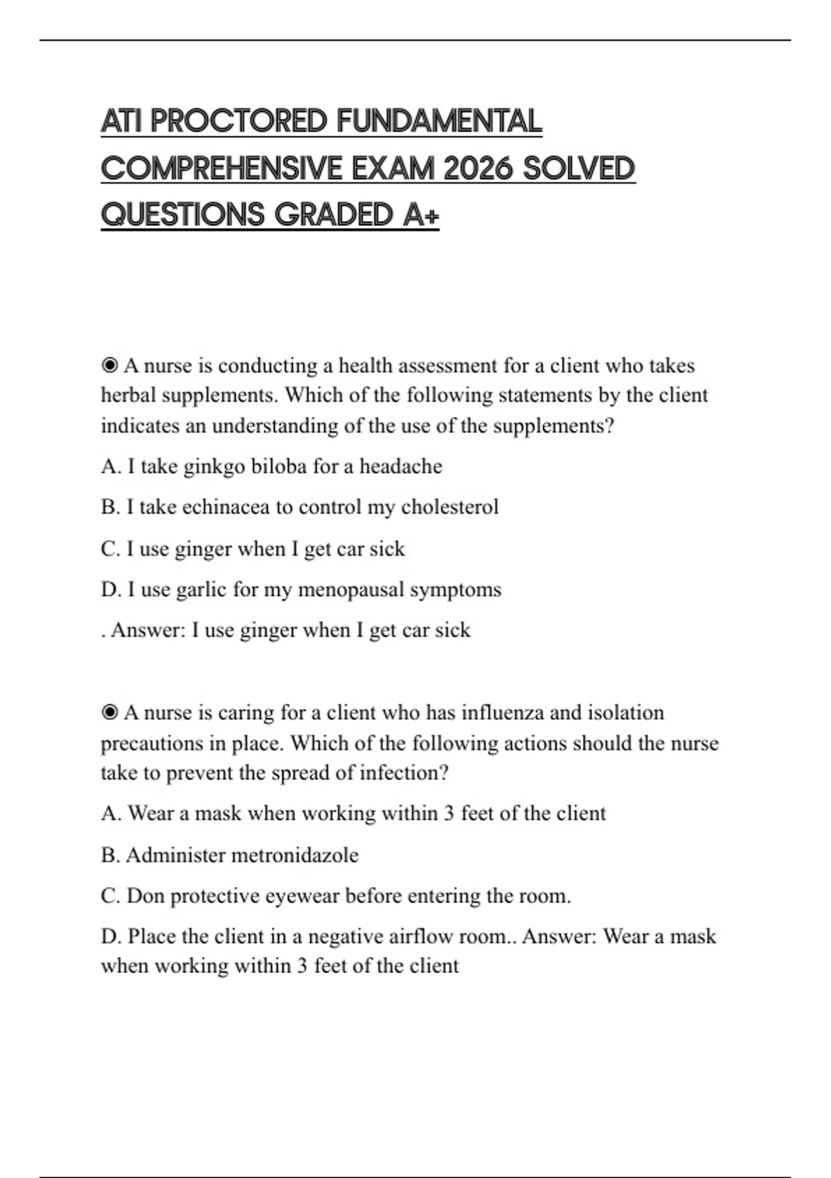 ATI PROCTORED FUNDAMENTAL COMPREHENSIVE EXAM 2026 SOLVED QUESTIONS GRADED A+