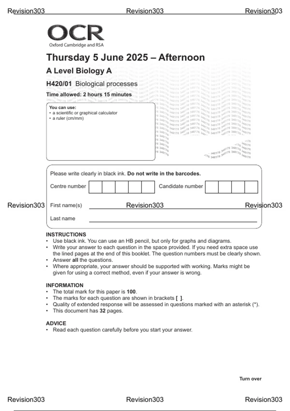 A-Level OCR 2025 Biology A Paper 1 biological Processes