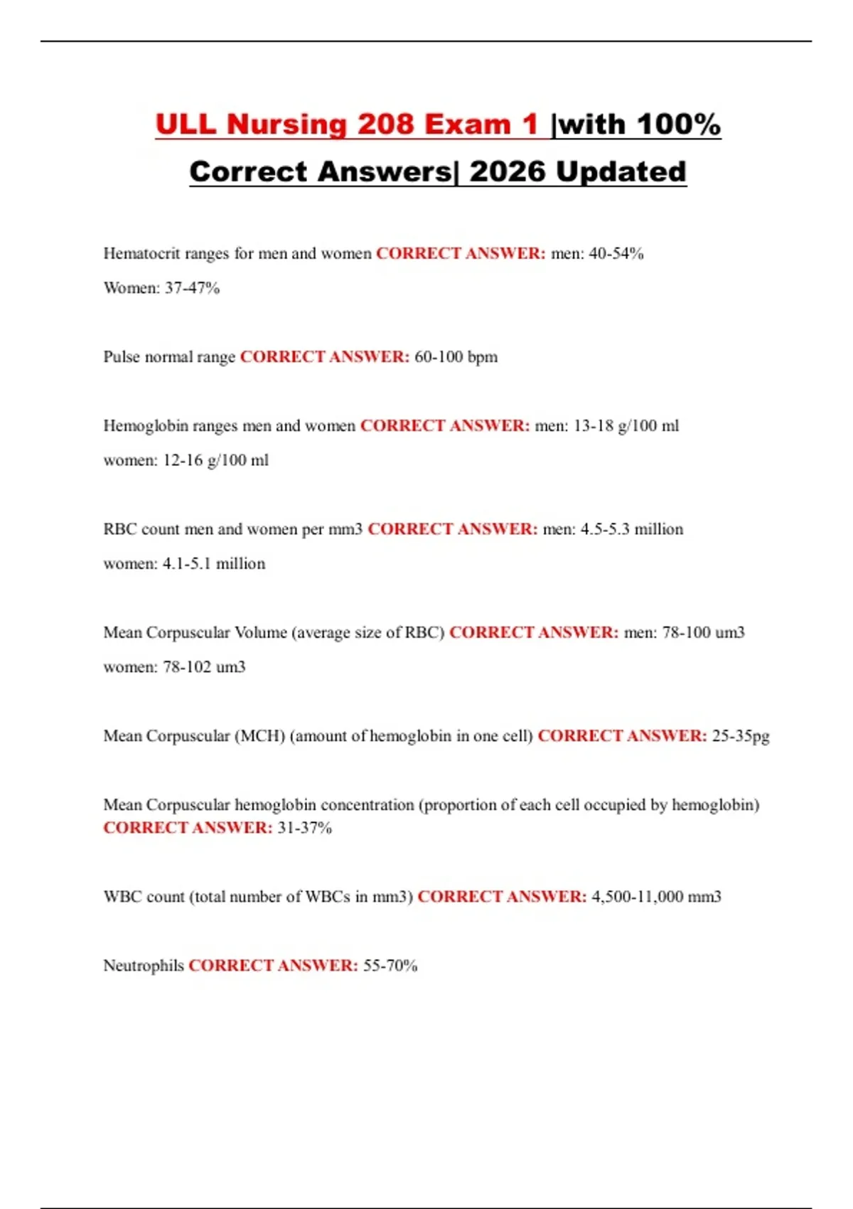 A full set of Nursing 208 Exam 1 review materials, including updated exam questions with 100% correct answers. It covers essential foundational content such as laboratory value ranges, respiratory conditions, oxygen delivery systems, electrolyte balance, acid–base values, fluid regulation, and clinical manifestations for key disorders. The material is structured to support comprehensive exam preparation and aligns with the current course expectations.