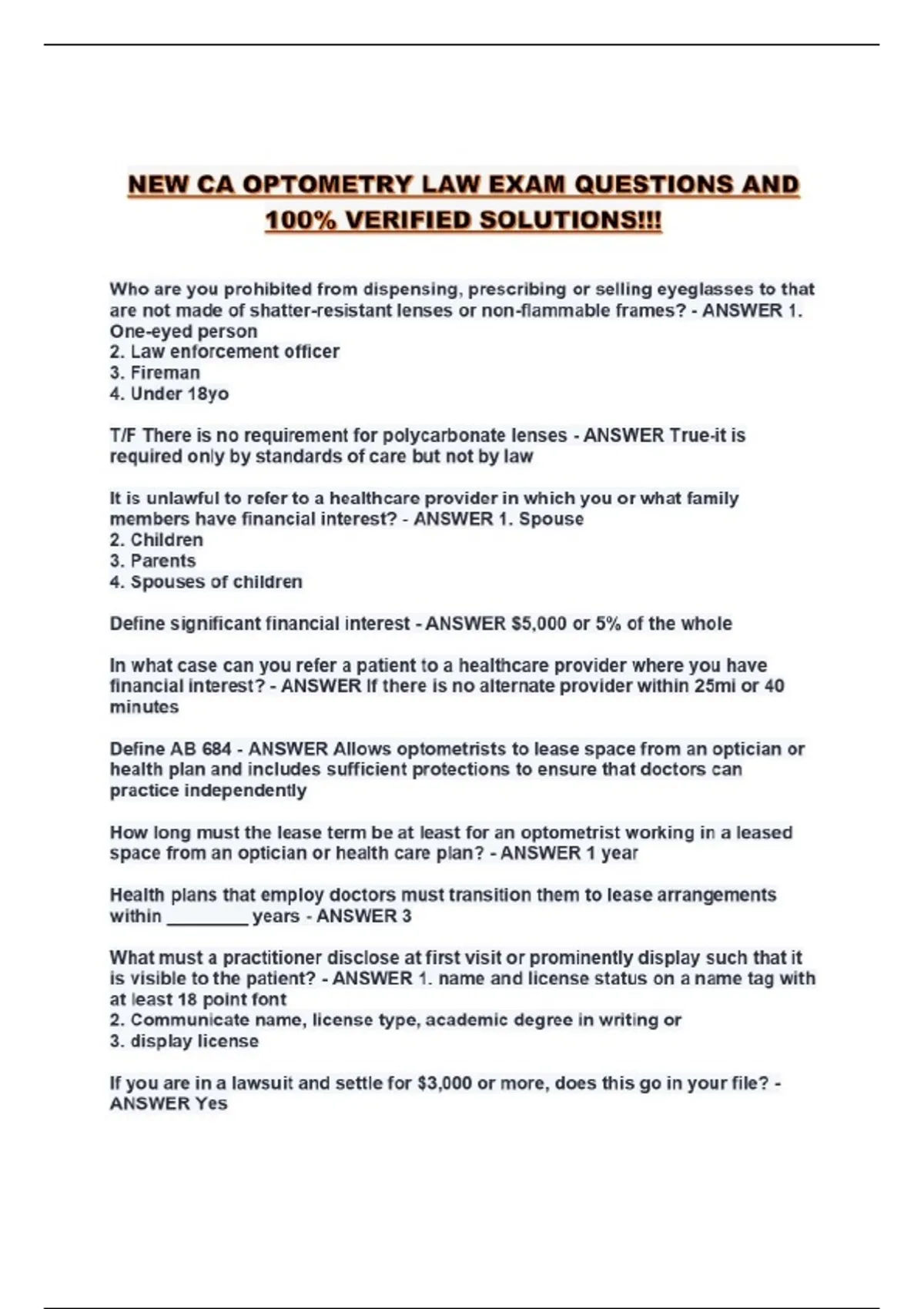 NEW CA OPTOMETRY LAW EXAM QUESTIONS AND 100% VERIFIED SOLUTIONS!!!