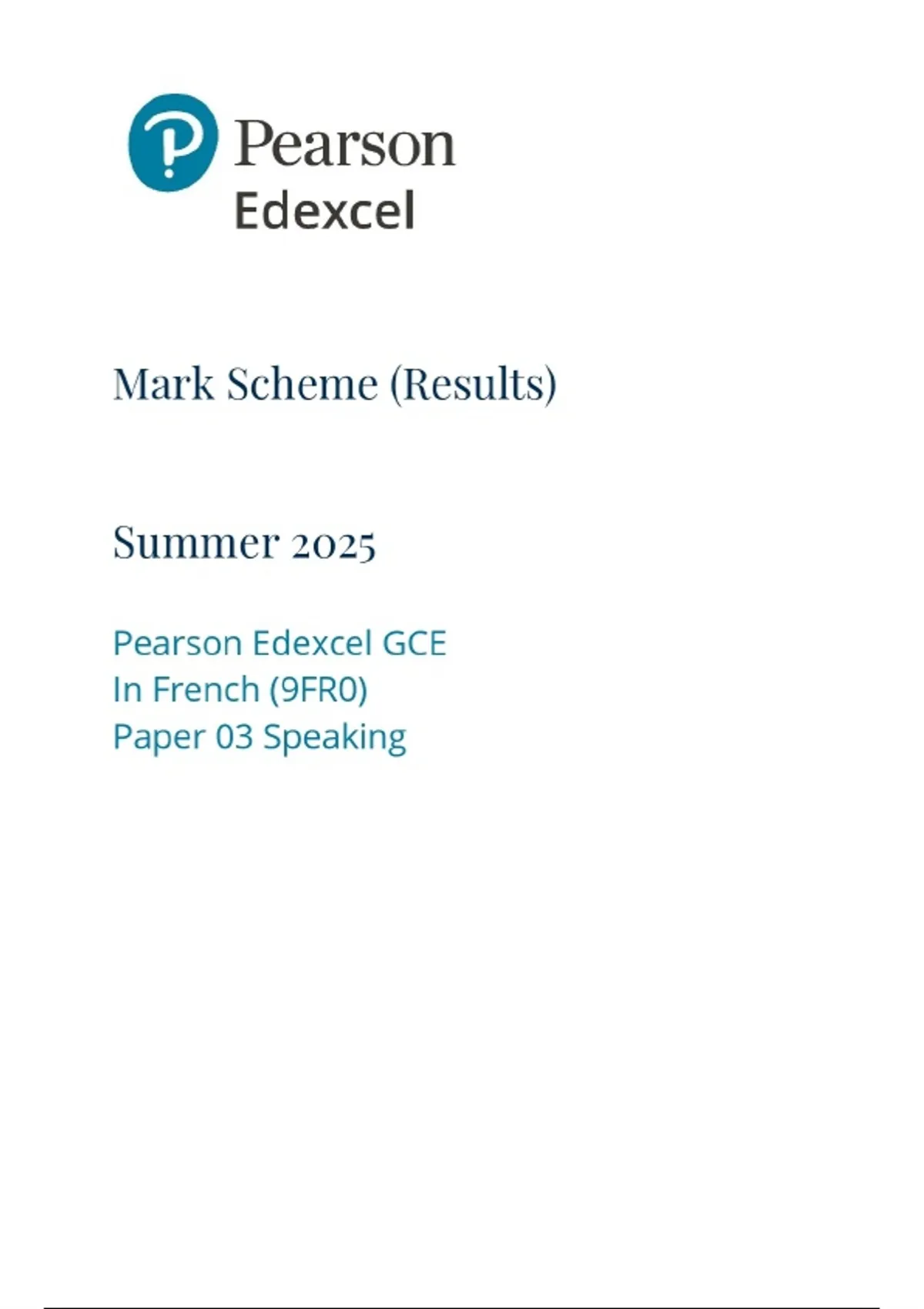 2025 Pearson Edexcel GCE In French (9FR0) Paper 03 Speaking Combined Question Paper and Marking Scheme