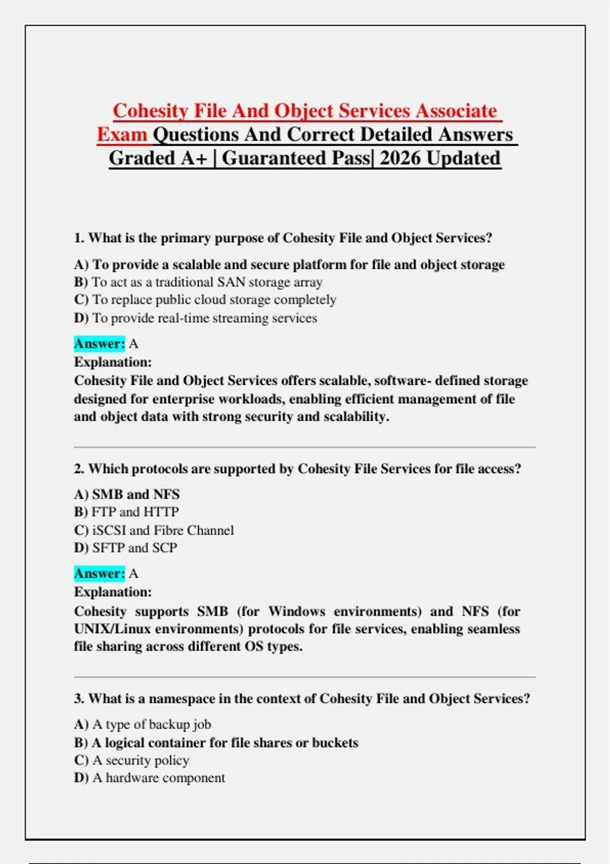 a full collection of 200+ practice questions with correct and detailed answers for the Cohesity File and Object Services Associate certification. It covers core topics such as namespaces, buckets, RBAC, deduplication, erasure coding, replication, access zones, ransomware protection, and cloud integrations. The material is complete, up-to-date, and aligned with current Cohesity exam objectives for comprehensive preparation.