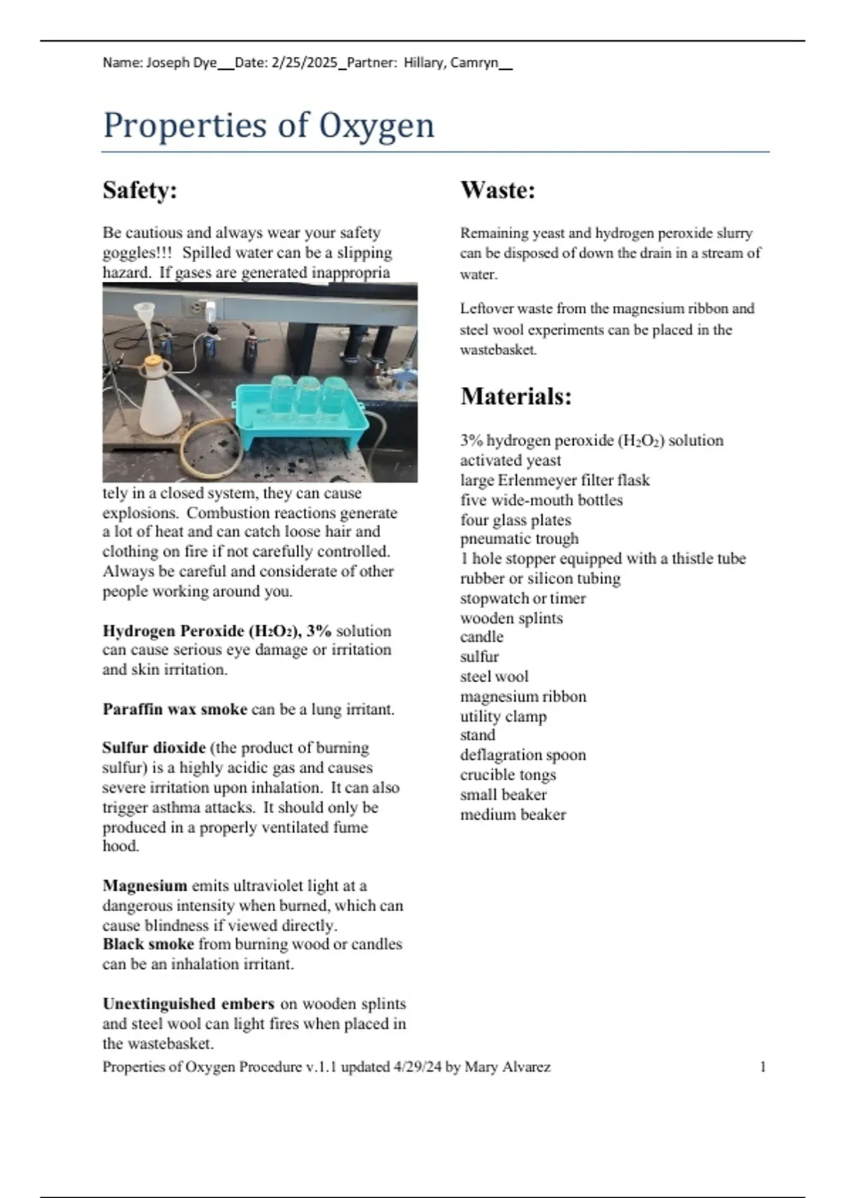 Properties of Oxygen Procedure v.1.1 updated 4/29/24 by Mary Alvarez 2