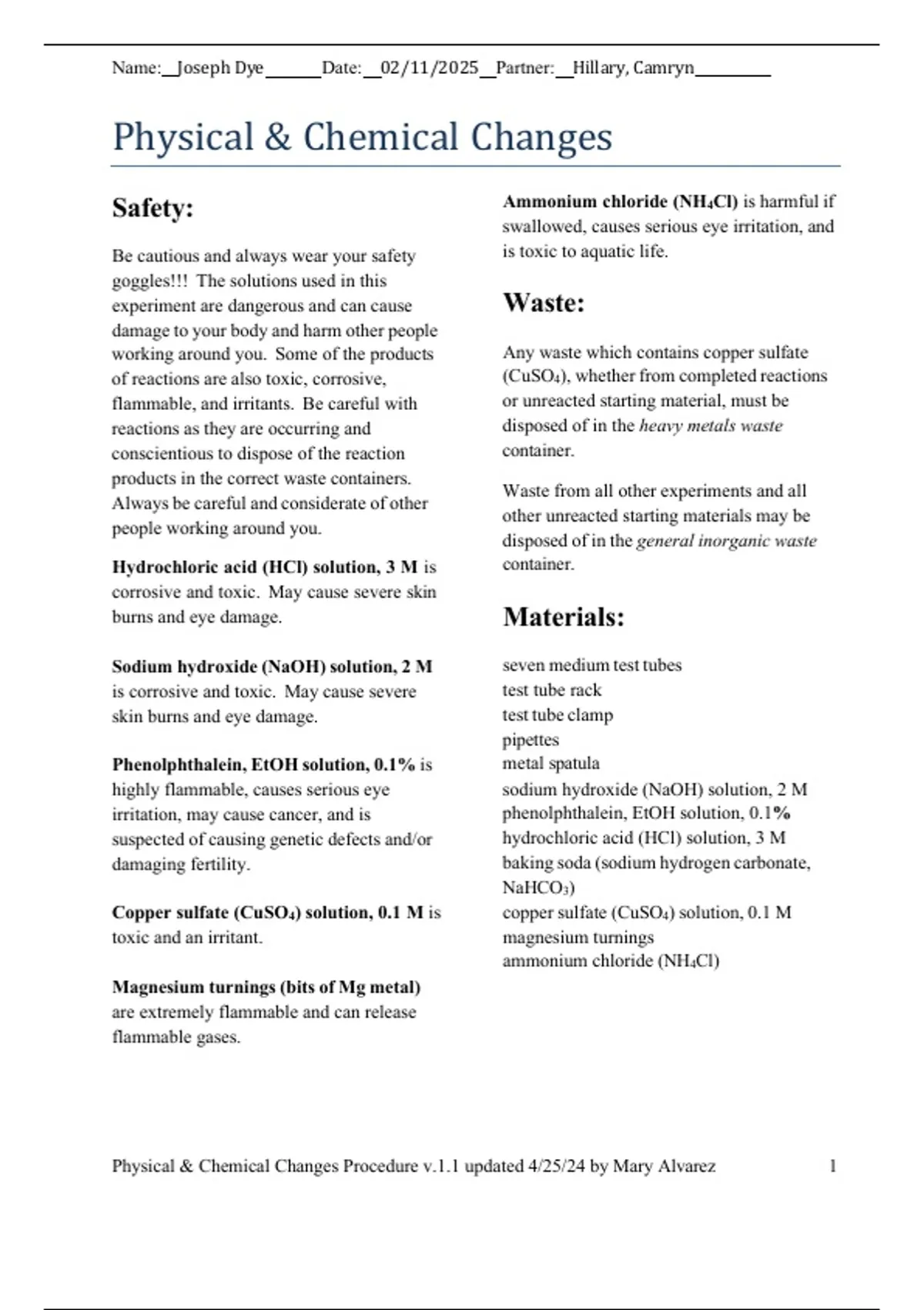 Physical & Chemical Changes Procedure v.1.1 updated 4/25/24 by Mary Alvarez 1