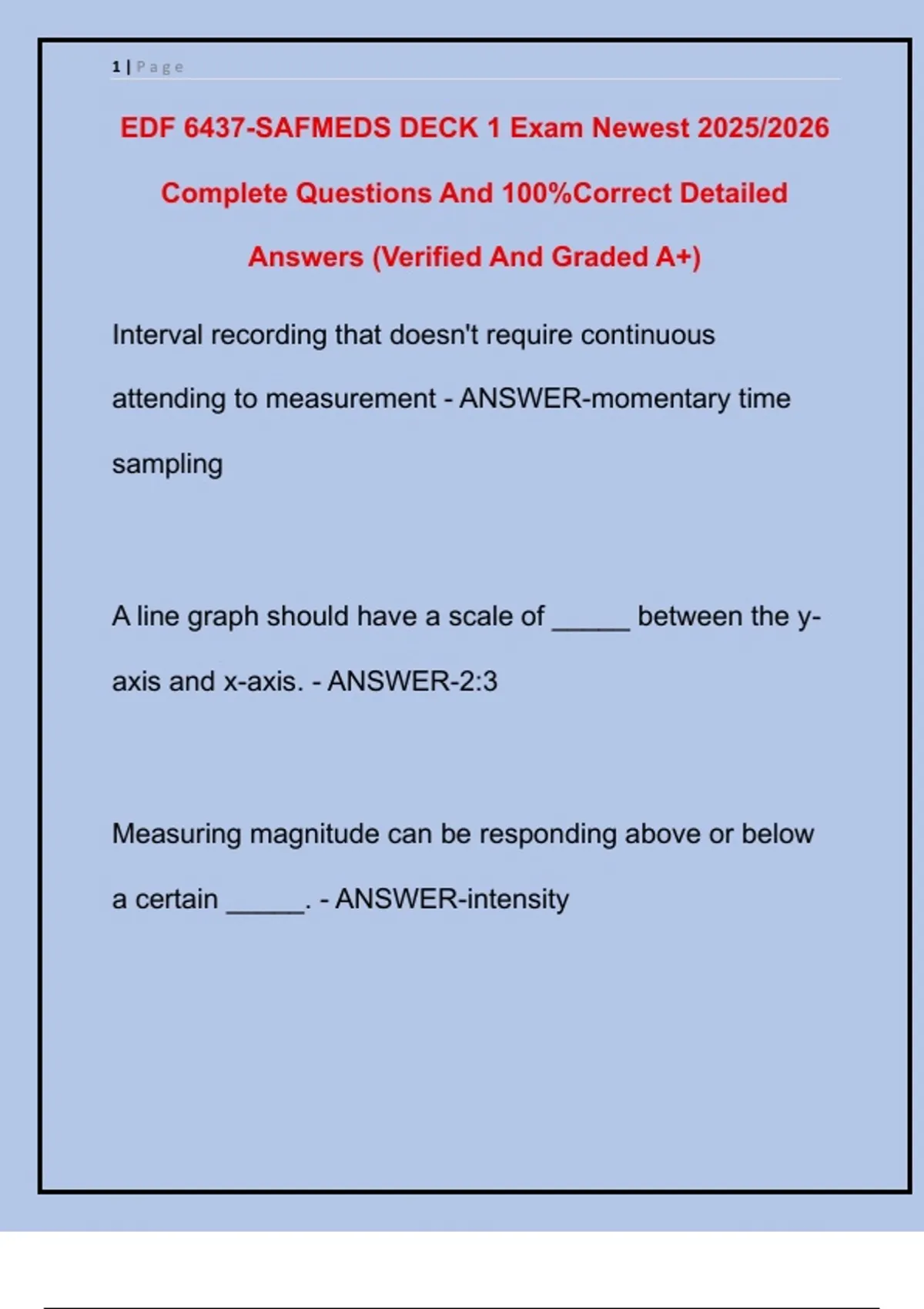EDF 6437-SAFMEDS DECK 1 Exam Newest 2025/2026 Complete Questions And 100%Correct Detailed Answers (Verified And Graded A+)