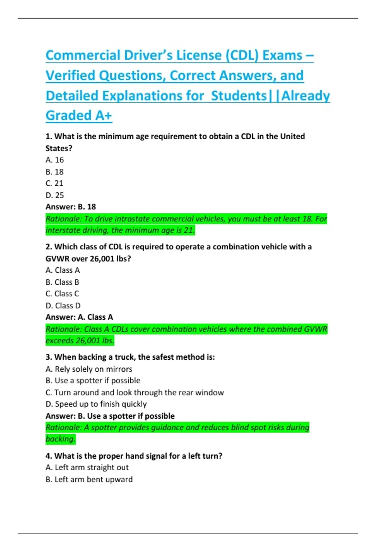 1. What is the minimum age requirement to obtain a CDL in the United States? A. 16 B. 18 C. 21 D. 25 Answer: B. 18 Rationale: To drive intrastate commercial vehicles, you must be at least 18. For interstate driving, the minimum age is 21. 2. Which class of CDL is required to operate a combination vehicle with a GVWR over 26,001 lbs? A. Class A B. Class B C. Class C D. Class D Answer: A. Class A Rationale: Class A CDLs cover combination vehicles where the combined GVWR exceeds 26,001 lbs. 3. When backing a truck, the safest method is: A. Rely solely on mirrors B. Use a spotter if possible C. Turn around and look through the rear window D. Speed up to finish quickly Answer: B. Use a spotter if possible Rationale: A spotter provides guidance and reduces blind spot risks during backing.