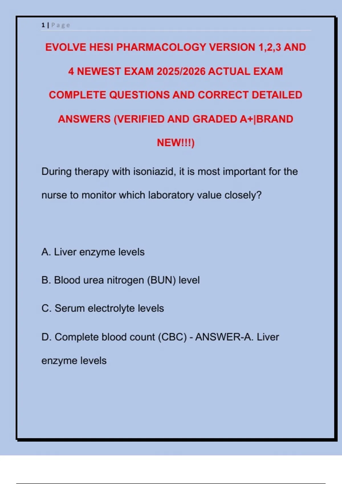D. Complete blood count (CBC) - ANSWER-A. Liver
