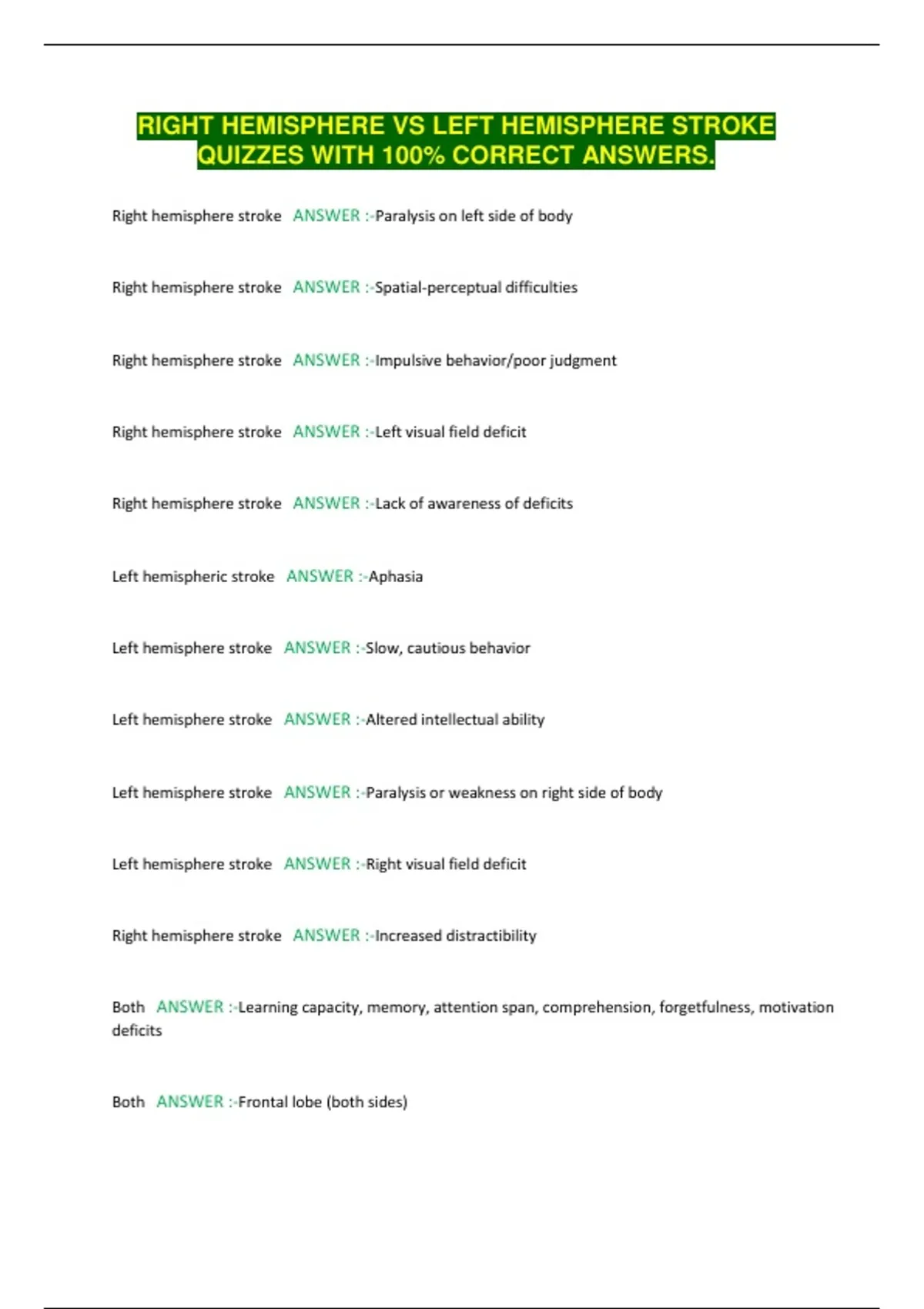 Left hemisphere stroke ANSWER :-Right visual field deficit