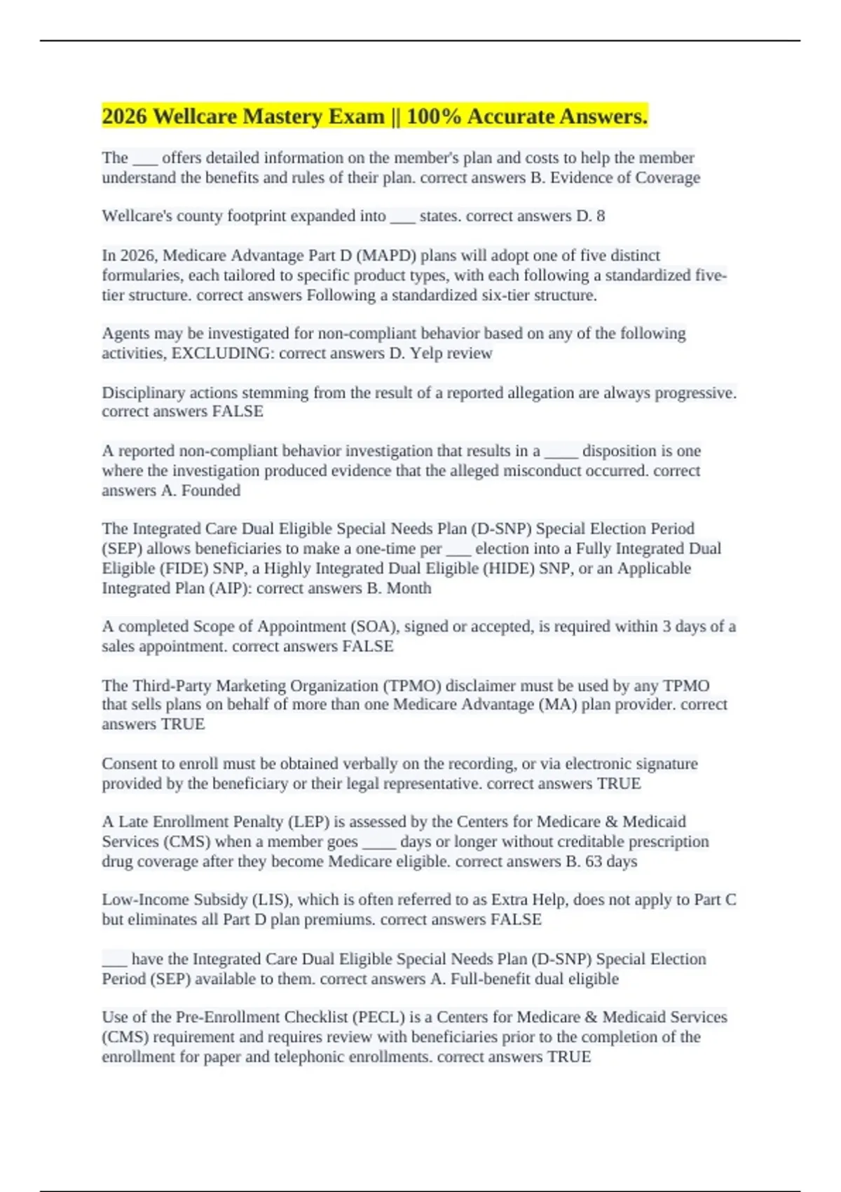 2026 Wellcare Mastery Exam || 100% Accurate Answers.