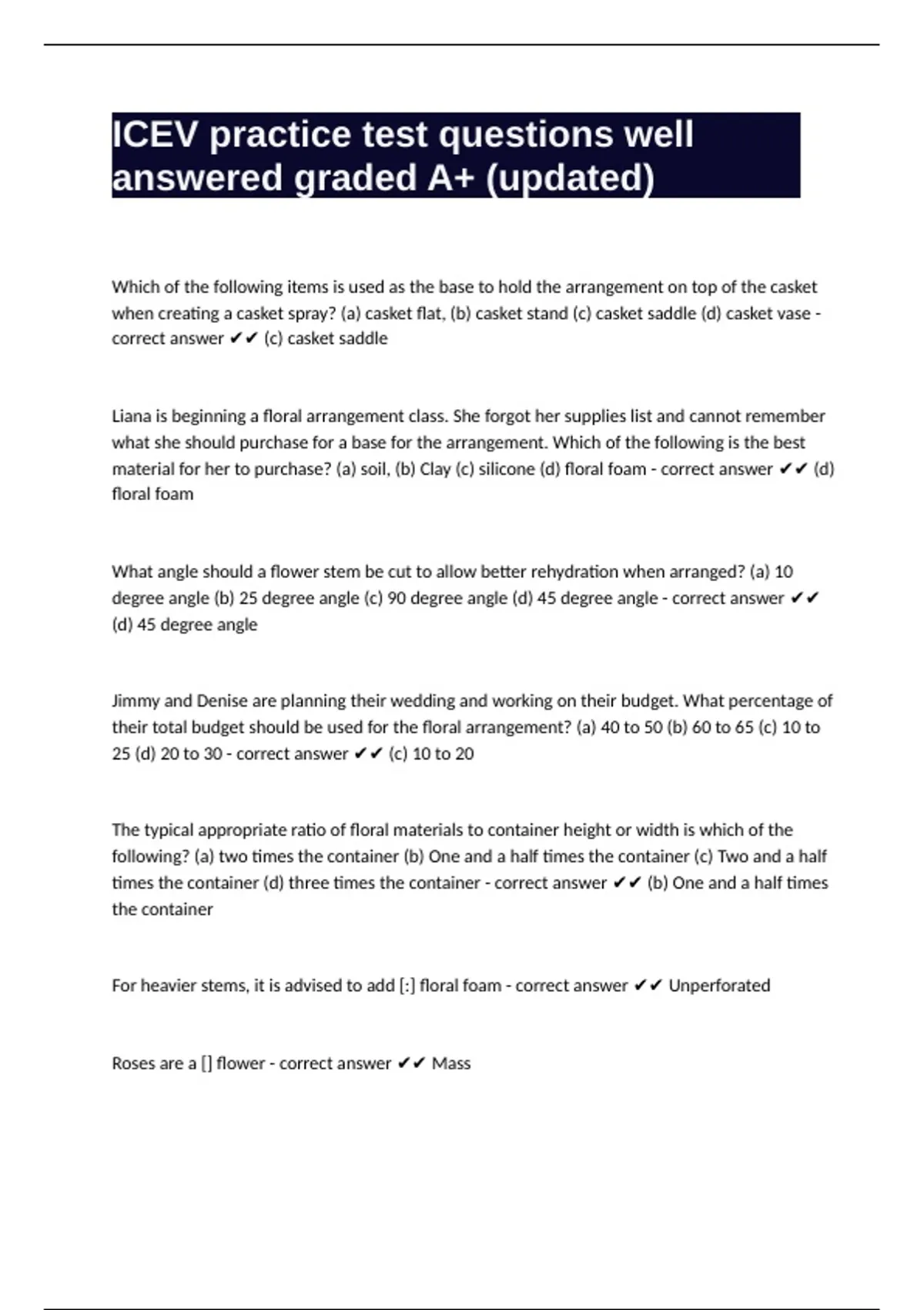 For heavier stems, it is advised to add [:] floral foam - correct answer ✔✔ Unperforated