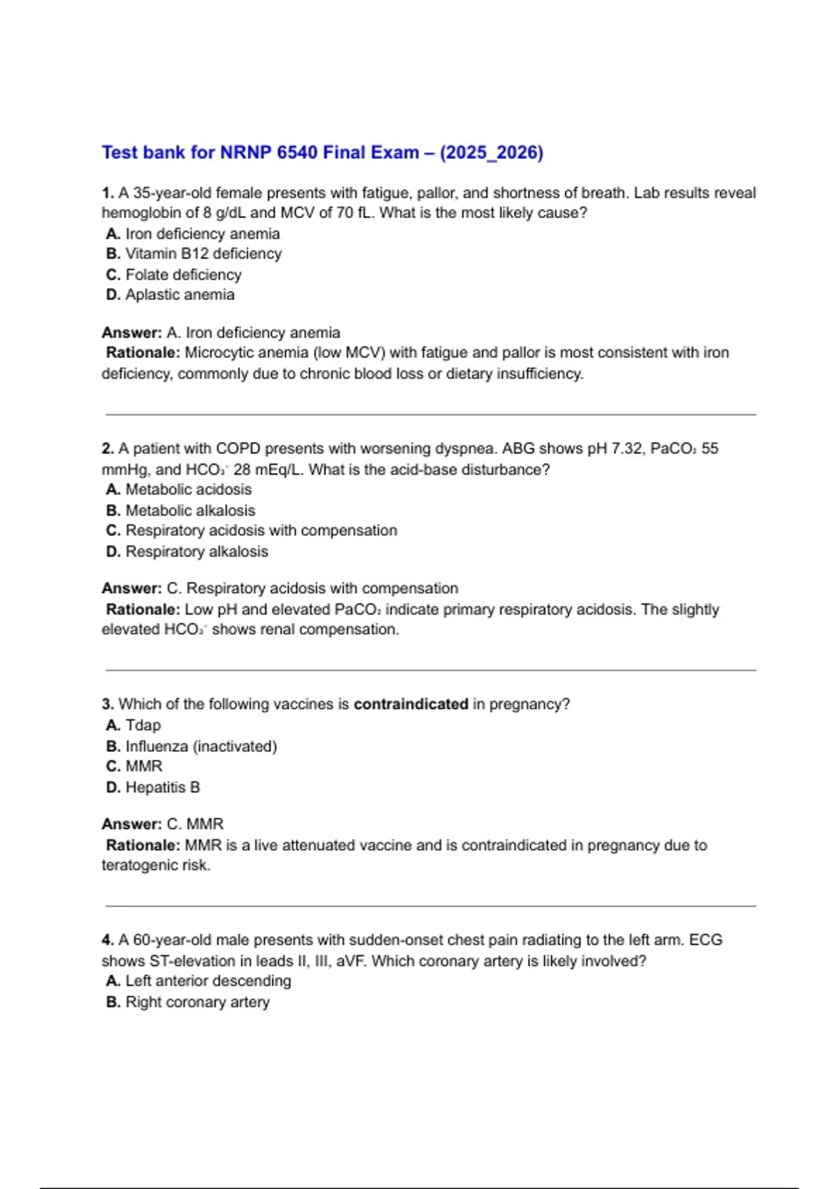 1. A 35-year-old female presents with fatigue, pallor, and shortness of breath. Lab results reveal