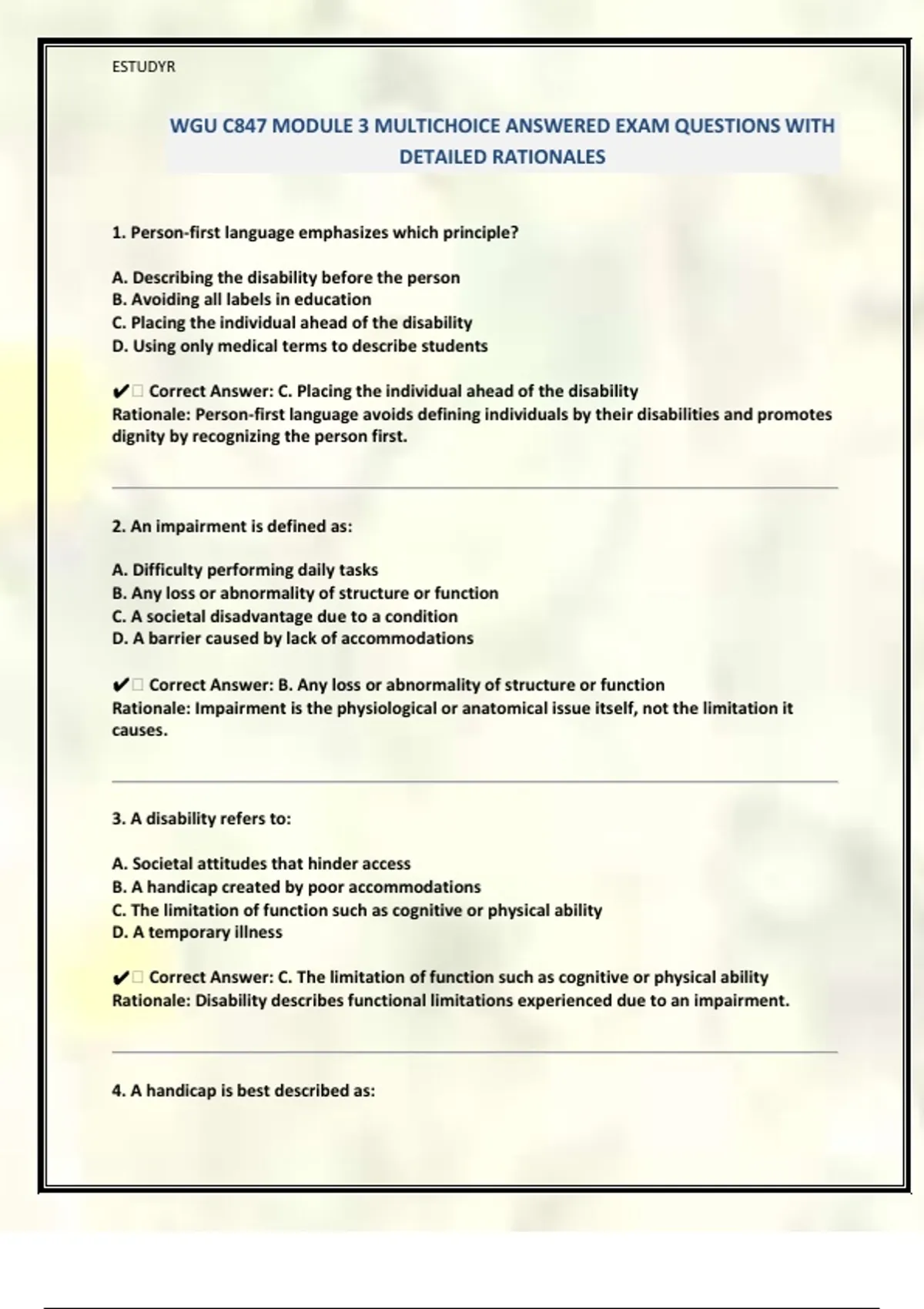 ✔ Correct Answer: B. The consequence of a disability, not the condition itself