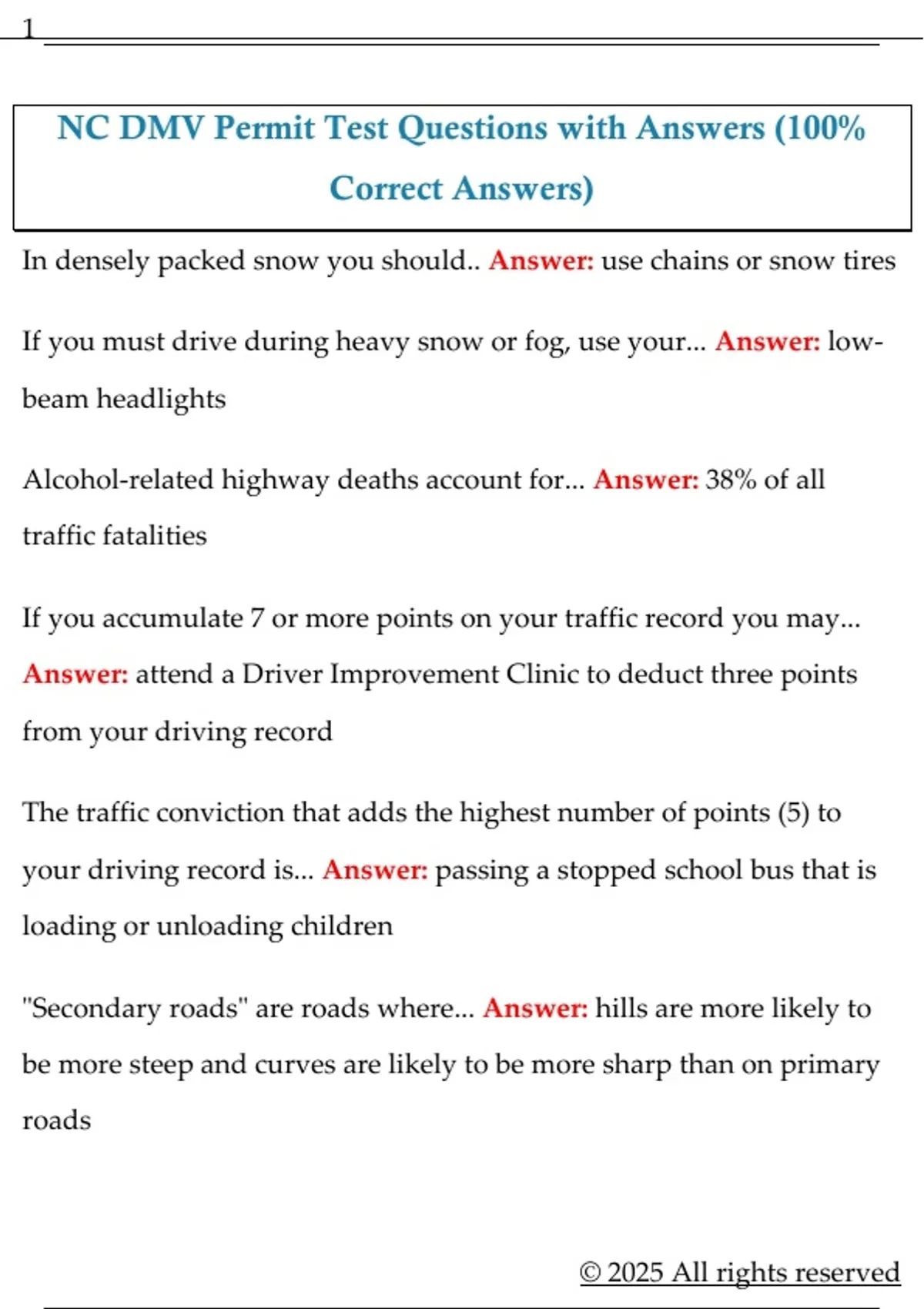 NC DMV Permit Test Questions with Answers (100% Correct Answers)
