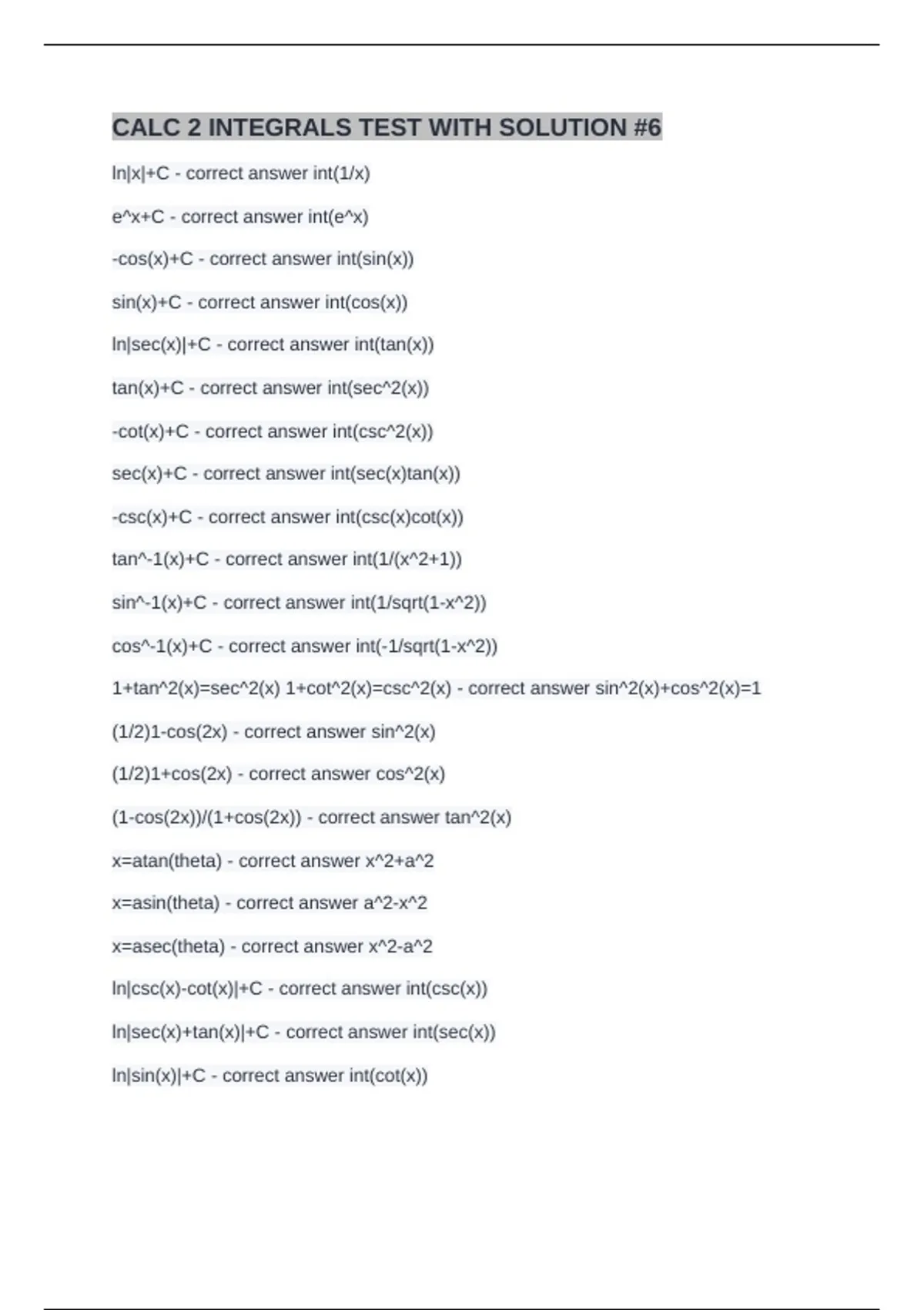 ln|sec(x)|+C - correct answer int(tan(x))