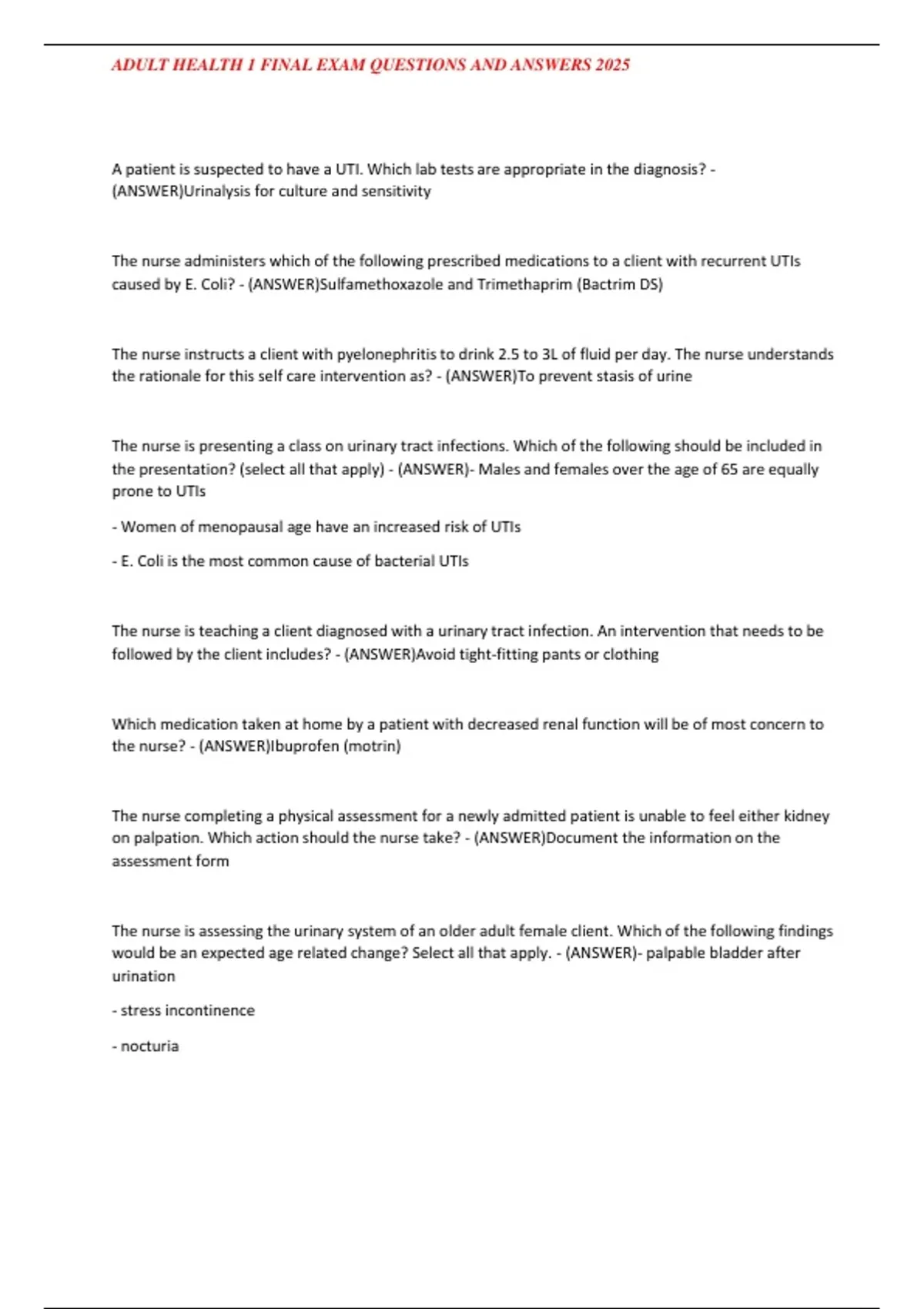 ,ADULT HEALTH 1 FINAL EXAM QUESTIONS AND ANSWERS 2025
