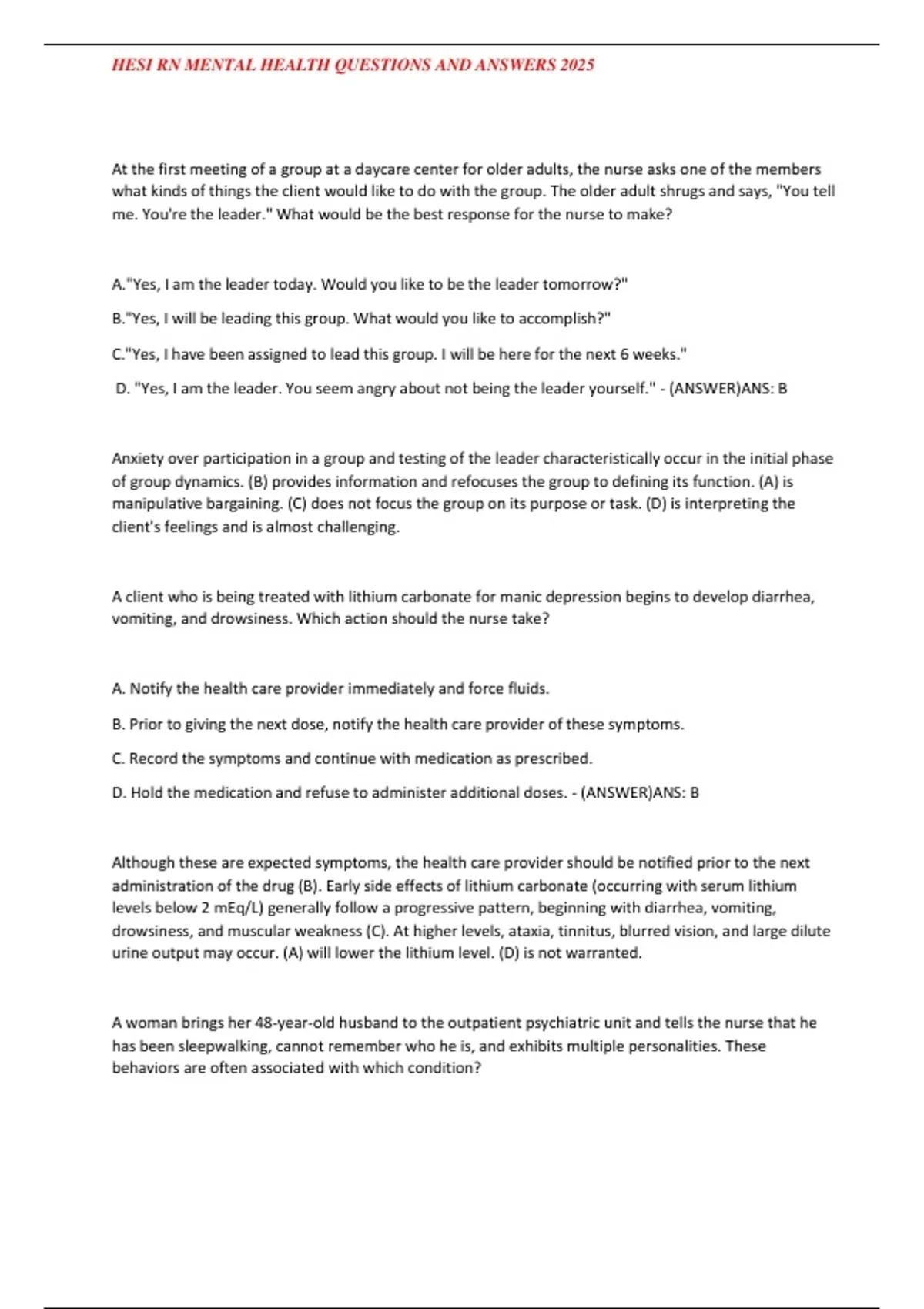 , HESI RN MENTAL HEALTH QUESTIONS AND ANSWERS 2025