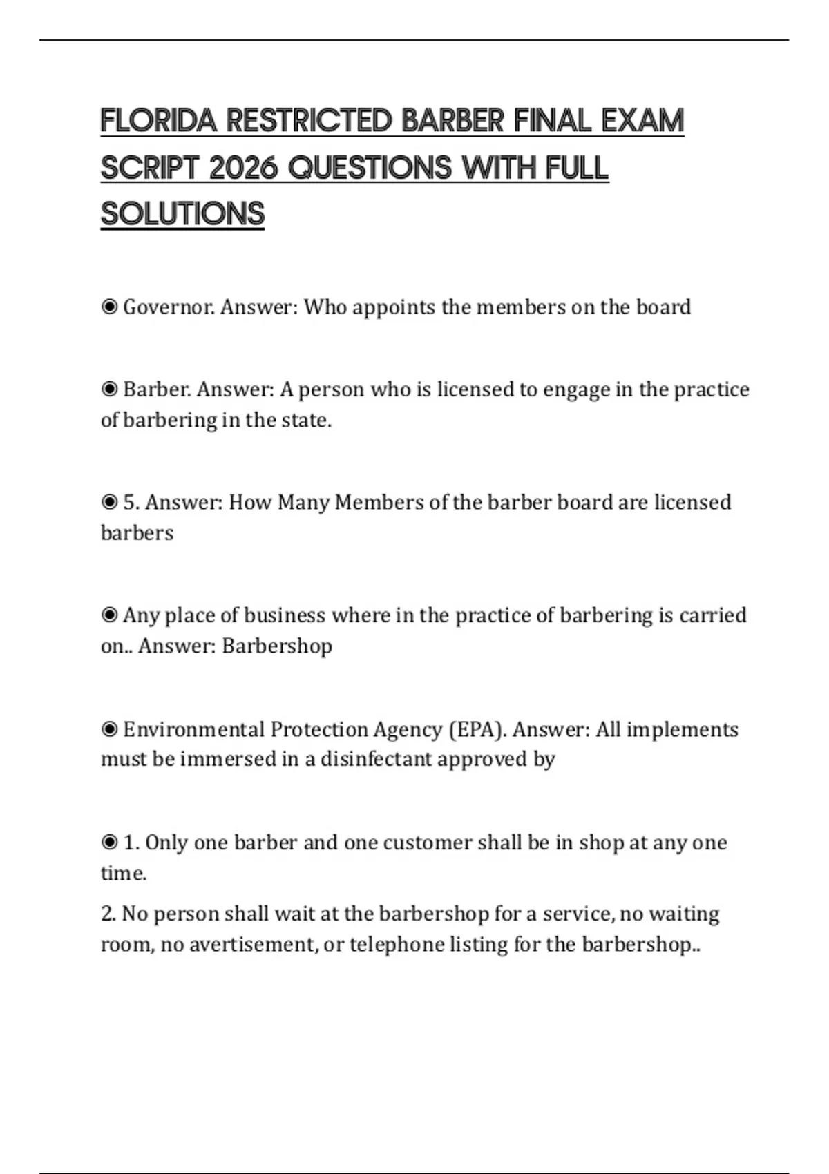 FLORIDA RESTRICTED BARBER FINAL EXAM SCRIPT 2026 QUESTIONS WITH FULL SOLUTIONS