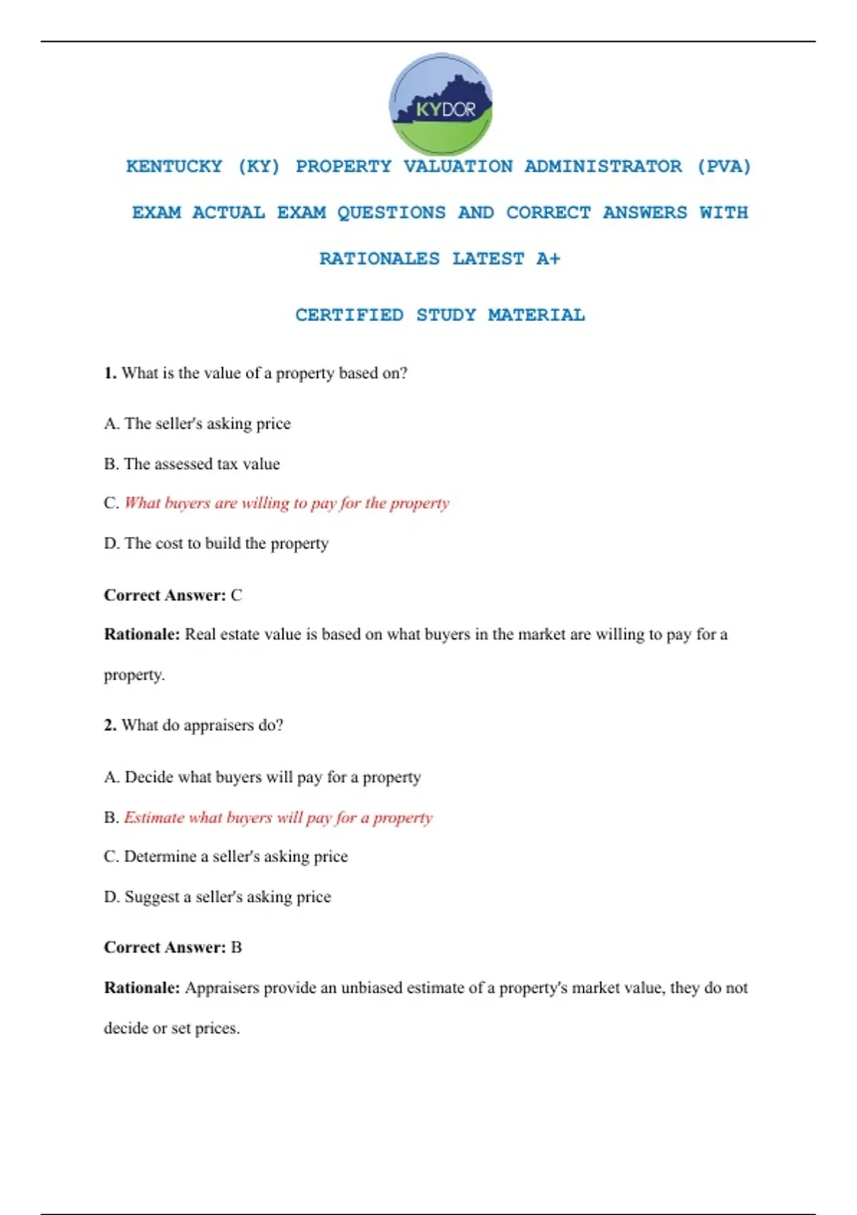 This resource is designed for candidates preparing for the Kentucky Property Valuation Administrator (PVA) Exam. It provides actual exam‑style questions with verified correct answers and detailed rationales to strengthen understanding. Coverage includes property tax law, valuation methods, assessment practices, and Kentucky‑specific regulations. Each item is aligned with the latest standards to ensure reliable and up‑to‑date preparation. This document is ideal for exam candidates, property valuation professionals, and individuals seeking a comprehensive review of PVA exam content. Clear explanations highlight key principles and help identify areas for improvement. Its structured format supports efficient studying and targeted review sessions. By practicing with exam‑aligned questions, learners can build confidence and improve their chances of passing the Kentucky PVA Exam. Prepare effectively with a resource built to support real exam success.