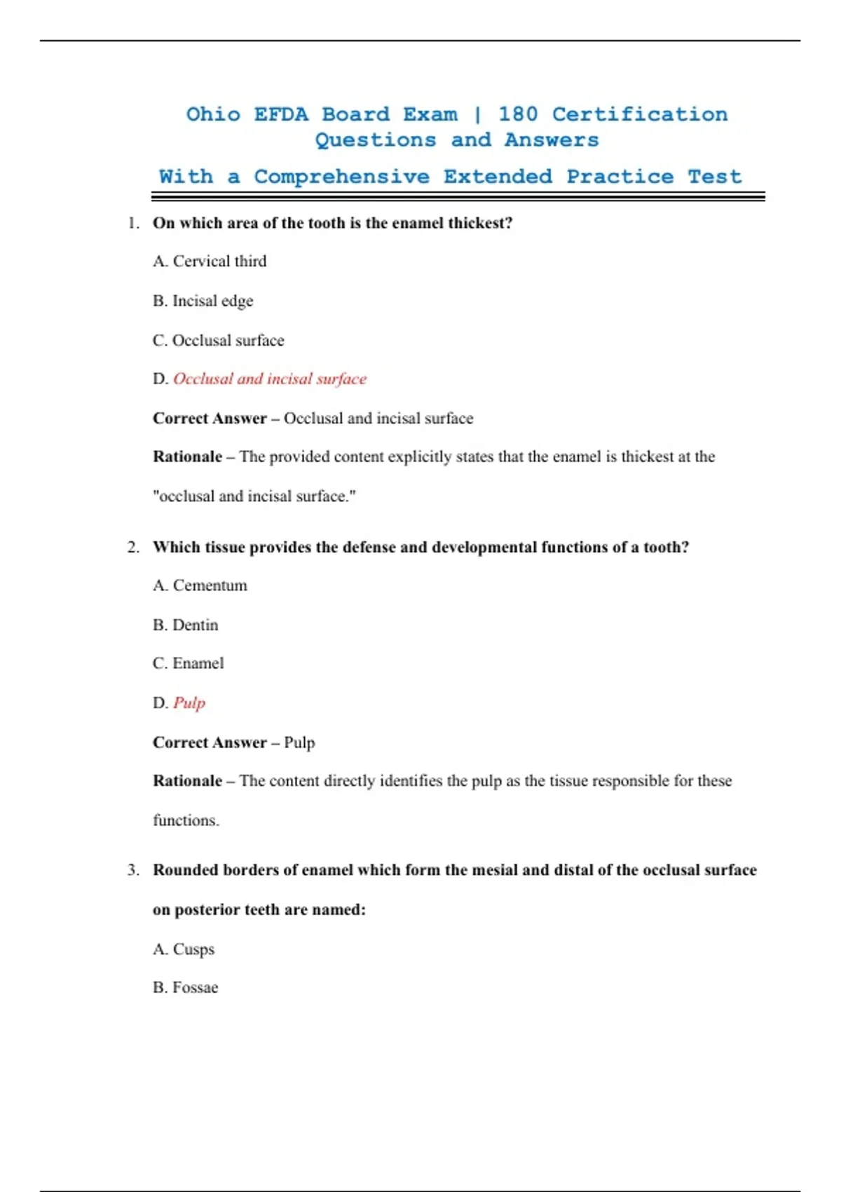 This resource is designed for candidates preparing for the Ohio Expanded Function Dental Auxiliary (EFDA) Board Exam. It provides 180 certification questions with verified correct answers and detailed rationales to reinforce learning. Coverage includes dental materials, restorative procedures, infection control, patient safety, and Ohio‑specific EFDA regulations. Each item is aligned with the latest board standards to ensure reliable and up‑to‑date preparation. This document is ideal for EFDA candidates, dental professionals, and students seeking a structured review of exam content. Clear explanations highlight key principles and help identify areas for improvement. Its organized format supports efficient studying and extended practice sessions. By working through exam‑aligned questions, learners can build confidence and improve their chances of passing the Ohio EFDA Board Exam. Prepare effectively with a resource built to support real exam success.