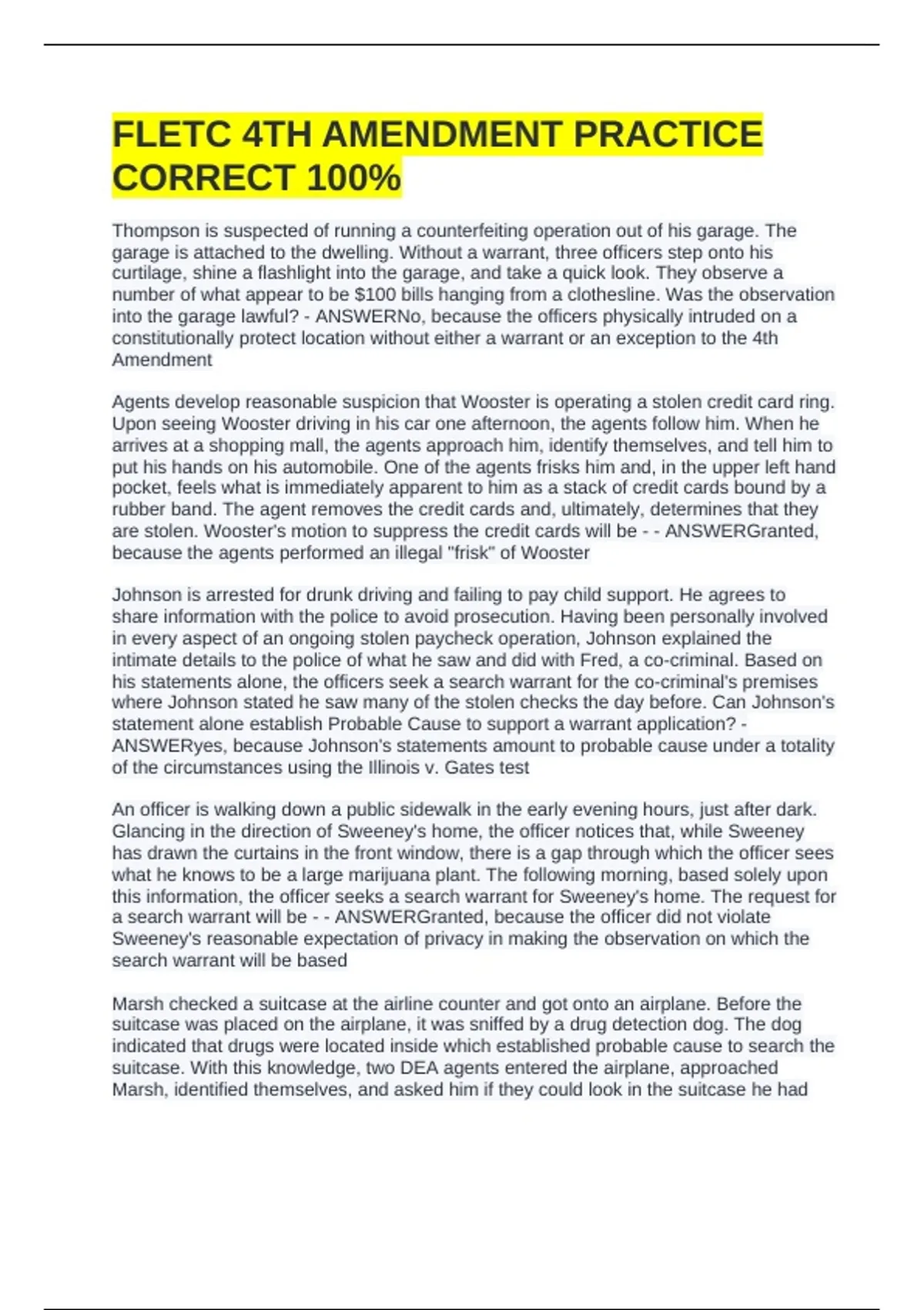 FLETC 4TH AMENDMENT PRACTICE CORRECT 100%