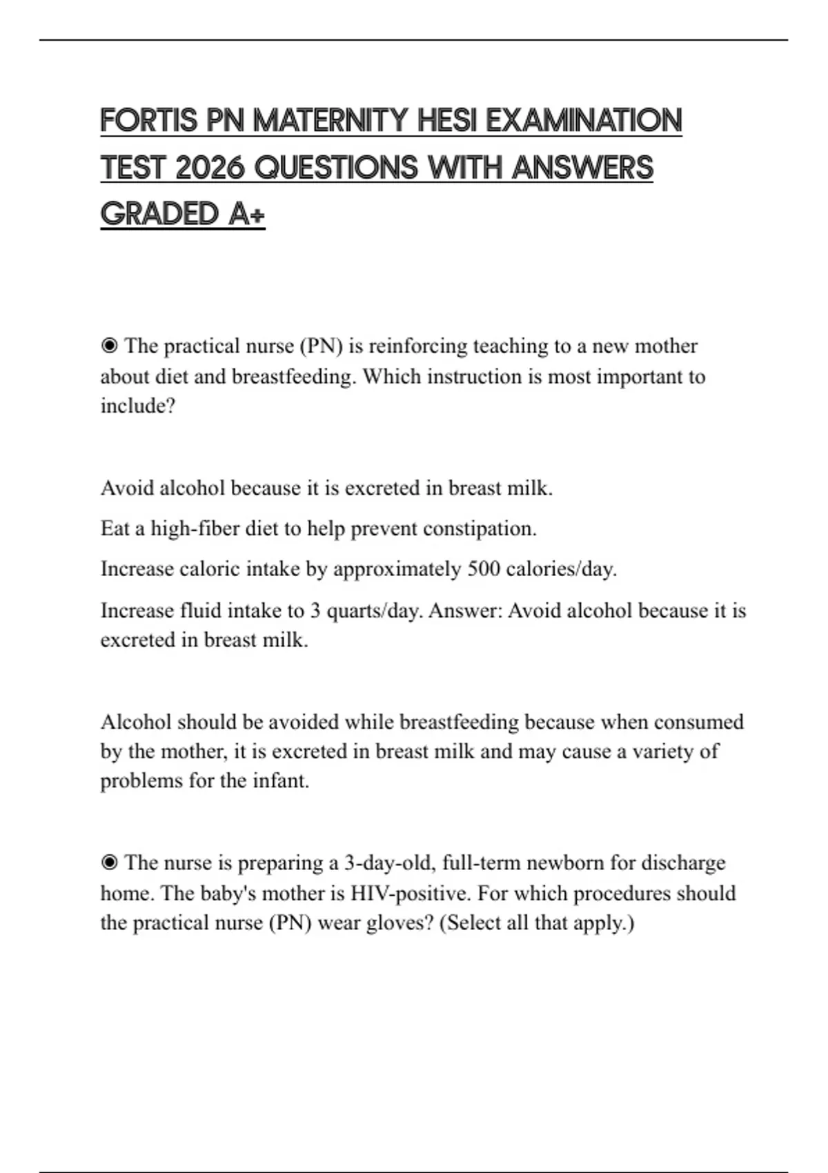 FORTIS PN MATERNITY HESI EXAMINATION TEST 2026 QUESTIONS WITH ANSWERS GRADED A+