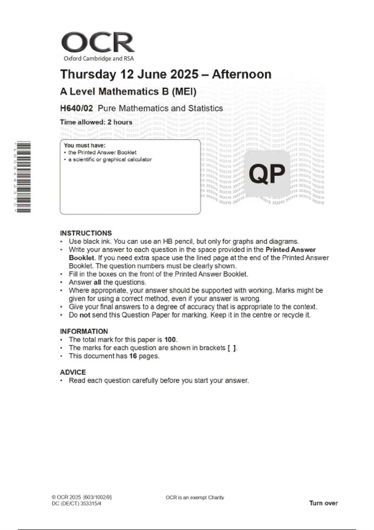 2025 OCR A Level Mathematics B (MEI) H640/02 Pure Mathematics and Statistics Combined Question Paper & Final Marking Scheme