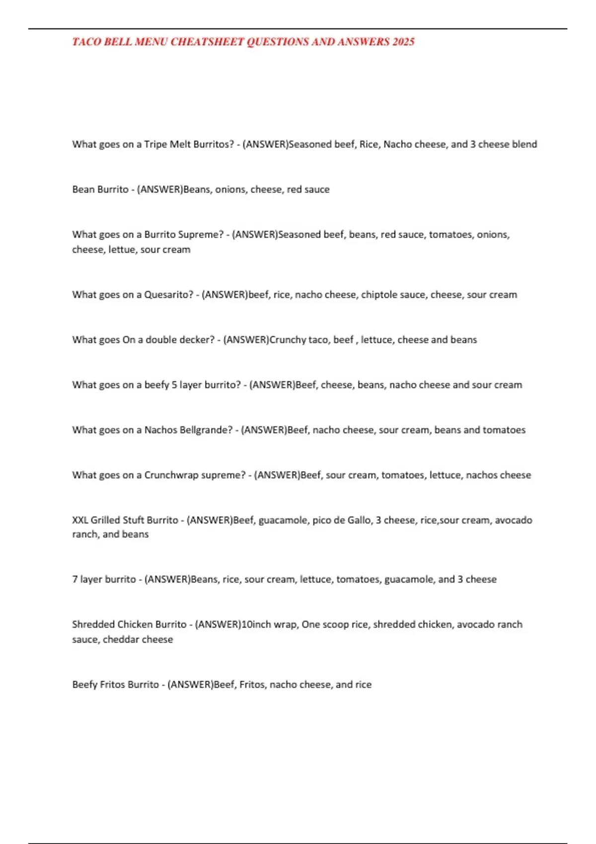 TACO BELL MENU CHEATSHEET QUESTIONS AND ANSWERS 2025
