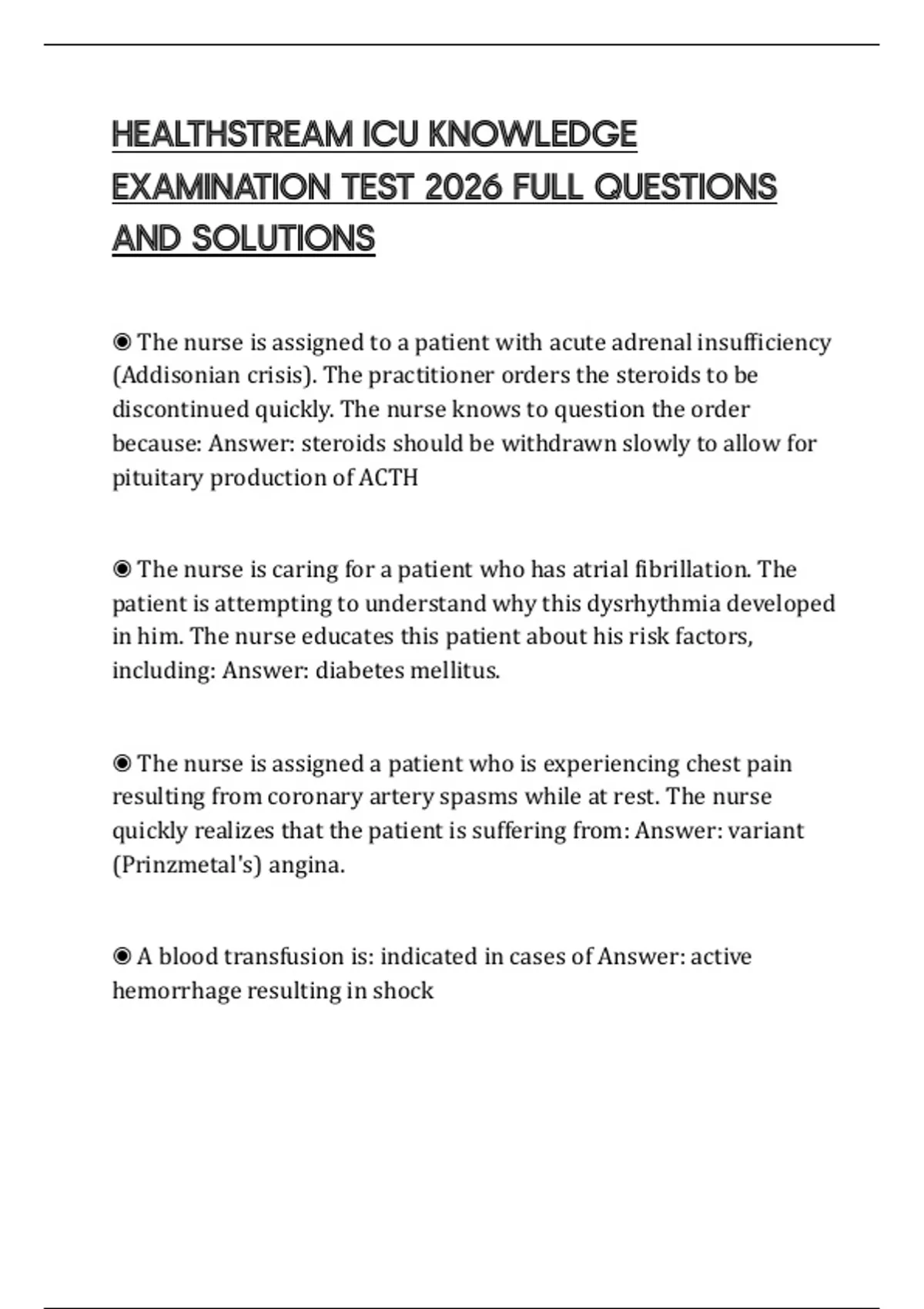 HEALTHSTREAM ICU KNOWLEDGE EXAMINATION TEST 2026 FULL QUESTIONS AND SOLUTIONS