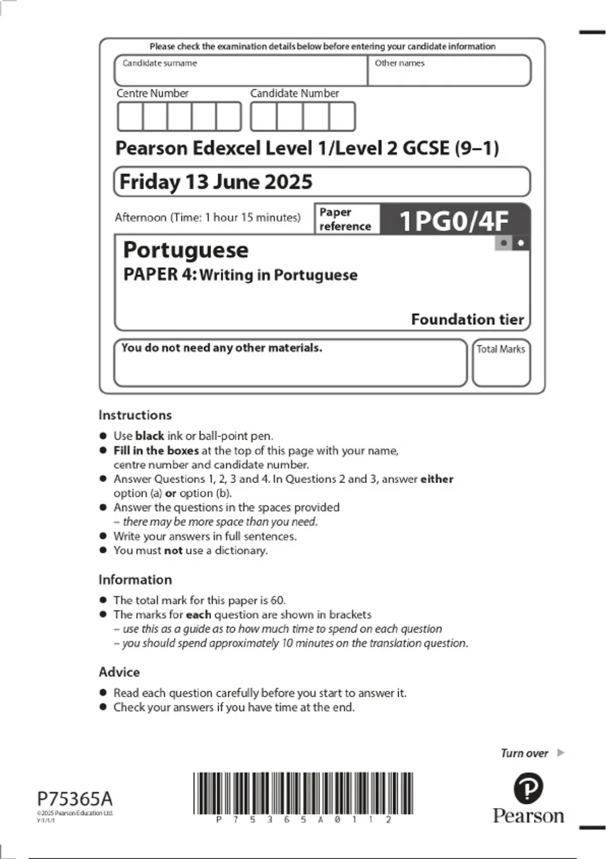 2025 Pearson Edexcel Level 1/Level 2 GCSE (9–1) Portuguese PAPER 4: Writing in Portuguese Foundation tier Combined Question Paper & Marking Scheme