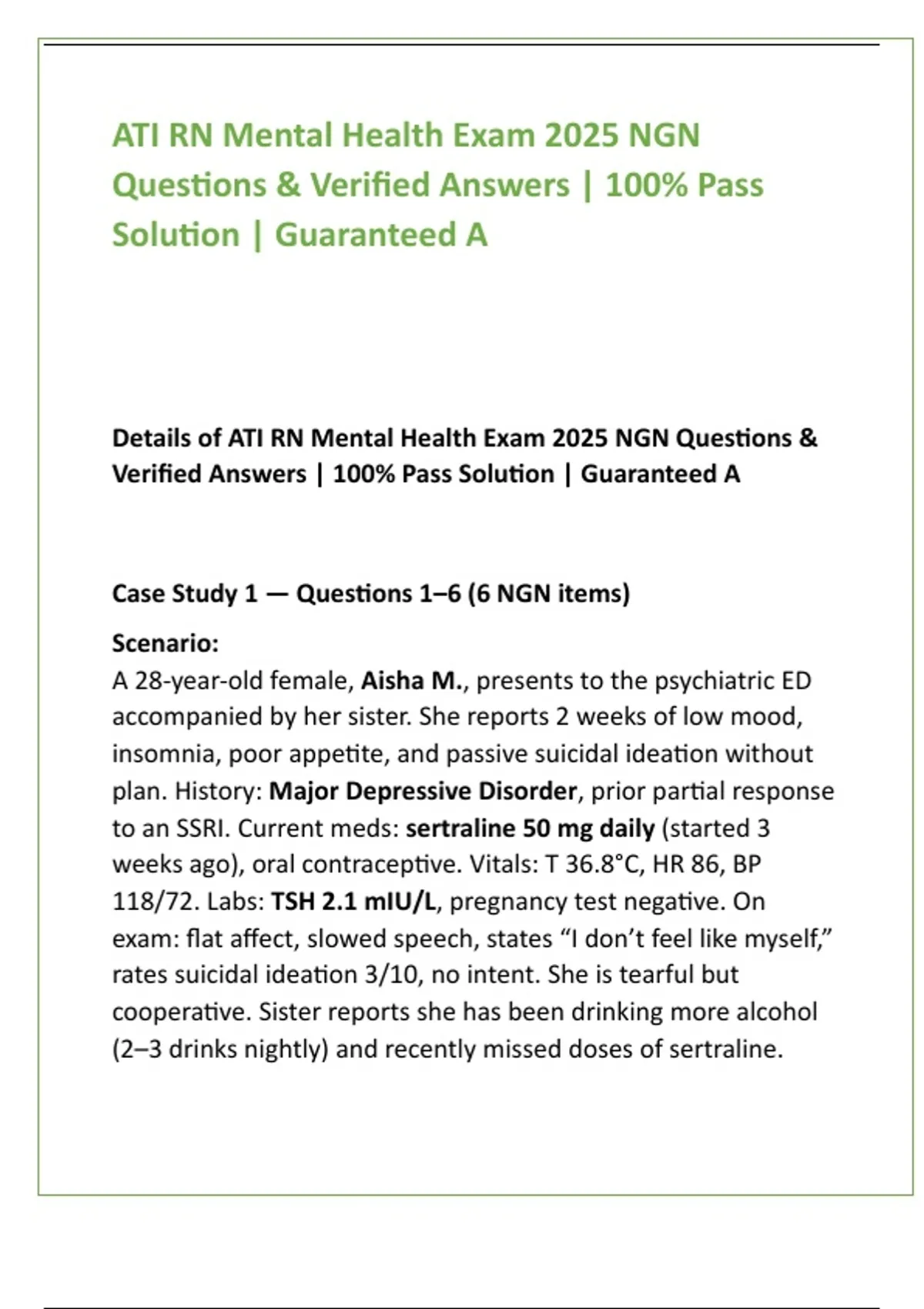 ATI RN Mental Health Exam 2025 NGN Test Bank | 200 Verified Answers | Mental Health Nursing Review | Guaranteed A & 100% Pass Solution 2) SEO Product Description (200–300 words) Master the ATI RN Mental Health Exam 2025 with this elite, exam-aligned NGN test bank designed to deliver a 100% Pass Solution and Guaranteed A-level scores. Built using the latest ATI Mental Health Review Module, 2025 ATI content outline, and Next-Generation NCLEX (NGN) Clinical Judgment Model, this digital resource gives nursing students the complete advantage needed to excel on one of ATI’s most challenging proctored exams. This comprehensive test bank includes high-fidelity NGN question formats—MCQ, SATA, Matrix, Bowtie, Drop-down, Trend, and Clinical Case Studies—mirroring the exact structure and difficulty level of the real ATI exam. Every item comes with verified correct answers and evidence-based rationales, ensuring deep understanding, rapid remediation, and boosted clinical reasoning skills. Students will strengthen mastery of psychiatric disorders, psychopharmacology, therapeutic communication, prioritization, mental status assessment, safety interventions, and crisis response. This resource is intentionally crafted to raise performance by 90–100%, giving learners the confidence and precision needed to outperform on ATI assessments, mental health modules, and clinical rotations. What’s Included (Fast Highlights): Complete 2025 ATI RN Mental Health NGN domain coverage 200+ exam-style NGN questions MCQs, SATA, Bowtie, Case Studies, Clinical Judgment items Verified answers + high-yield rationales Psychopharmacology, safety, SI precautions, therapeutic communication Digital, instant, study-ready format Designed for Guaranteed A-level results Perfect for students preparing for the ATI Mental Health Proctored Exam, ATI concept modules, NGN readiness, and psychiatric clinical excellence. This is the #1 high-value, score-boosting mental health test bank for 2025 ATI success. 3) 8 High-Value SEO Keywords ATI mental health NGN test bank ATI RN Mental Health Exam 2025 Mental health nursing test bank ATI proctored exam practice questions RN mental health verified answers NGN clinical judgment mental health ATI psychopharmacology review Mental health ATI question bank 4) 10 Optimized Hashtags #ATIMentalHealth #ATITestBank #ATIRN2025 #NGNQuestions #NursingStudents #MentalHealthNursing #NCLEXPrep2025 #NursingSchoolSuccess #ATIExamPrep #PsychNursingReview