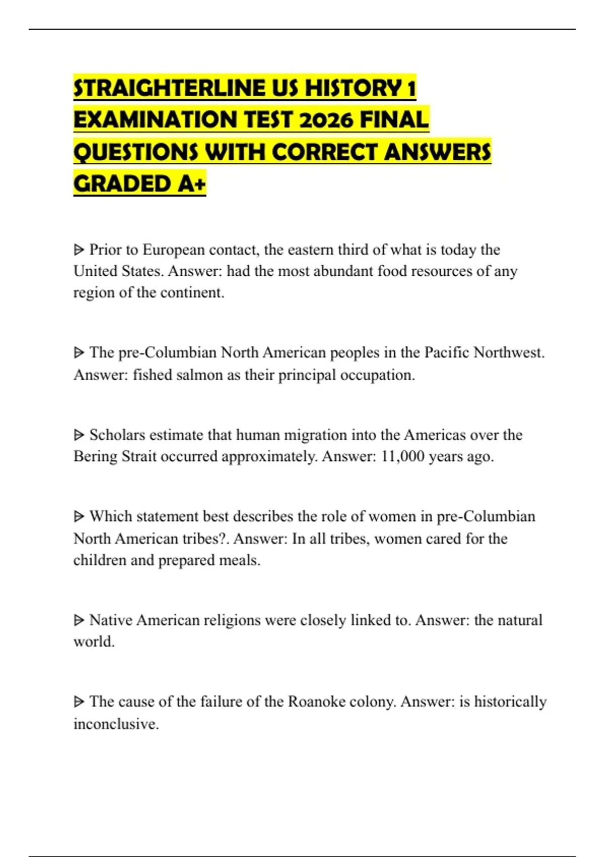 STRAIGHTERLINE US HISTORY 1 EXAMINATION TEST 2026 FINAL QUESTIONS WITH CORRECT ANSWERS GRADED A+